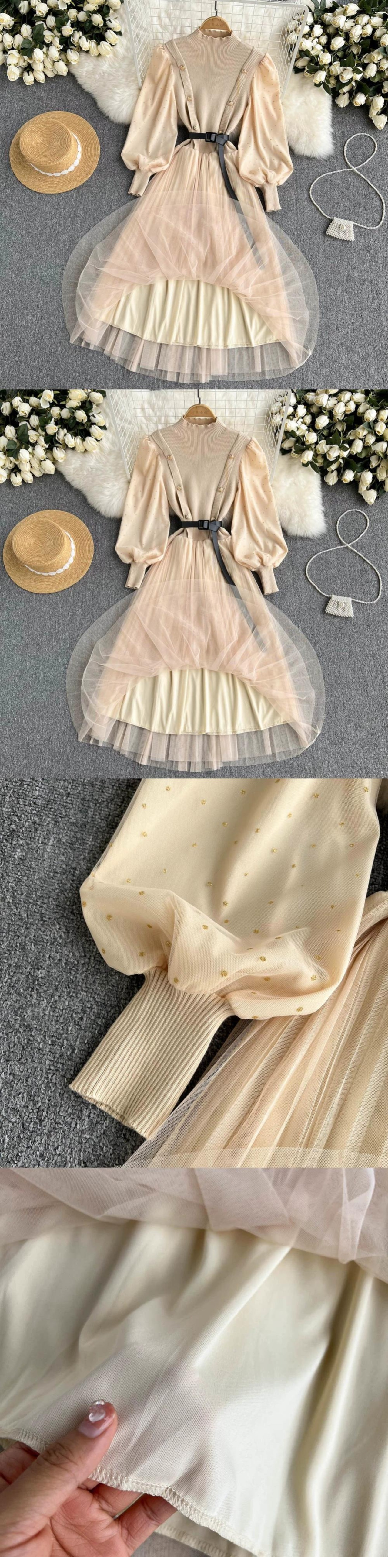 おしとやかな気質のランタンスリーブドレス秋の女性のフレンチニットパッチワークウエスト痩身メッシュ妖精スカート オータム 秋物 lyxaj83293027301
