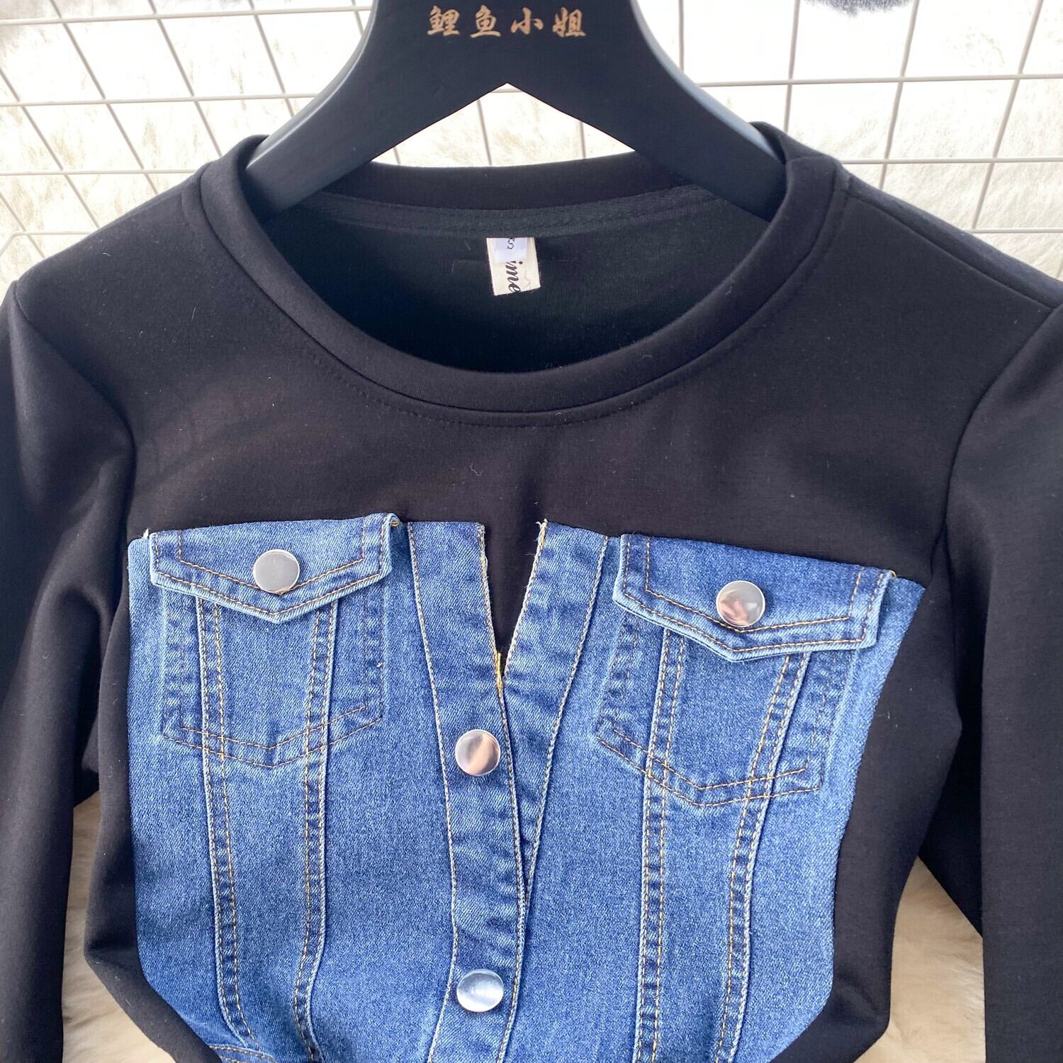 2023秋冬新作ニッチハイエンドラウンドネックフェイクツーピーススプライシングデニムドレススリムスリムロングスカート オータム 秋物 ウィンター 冬物 Oネック lyxaj99340362892