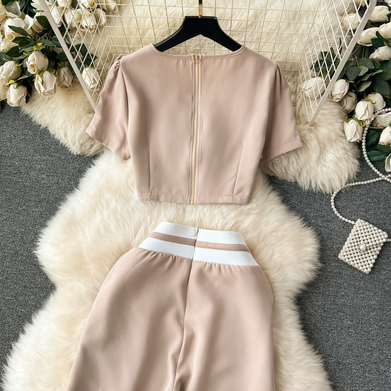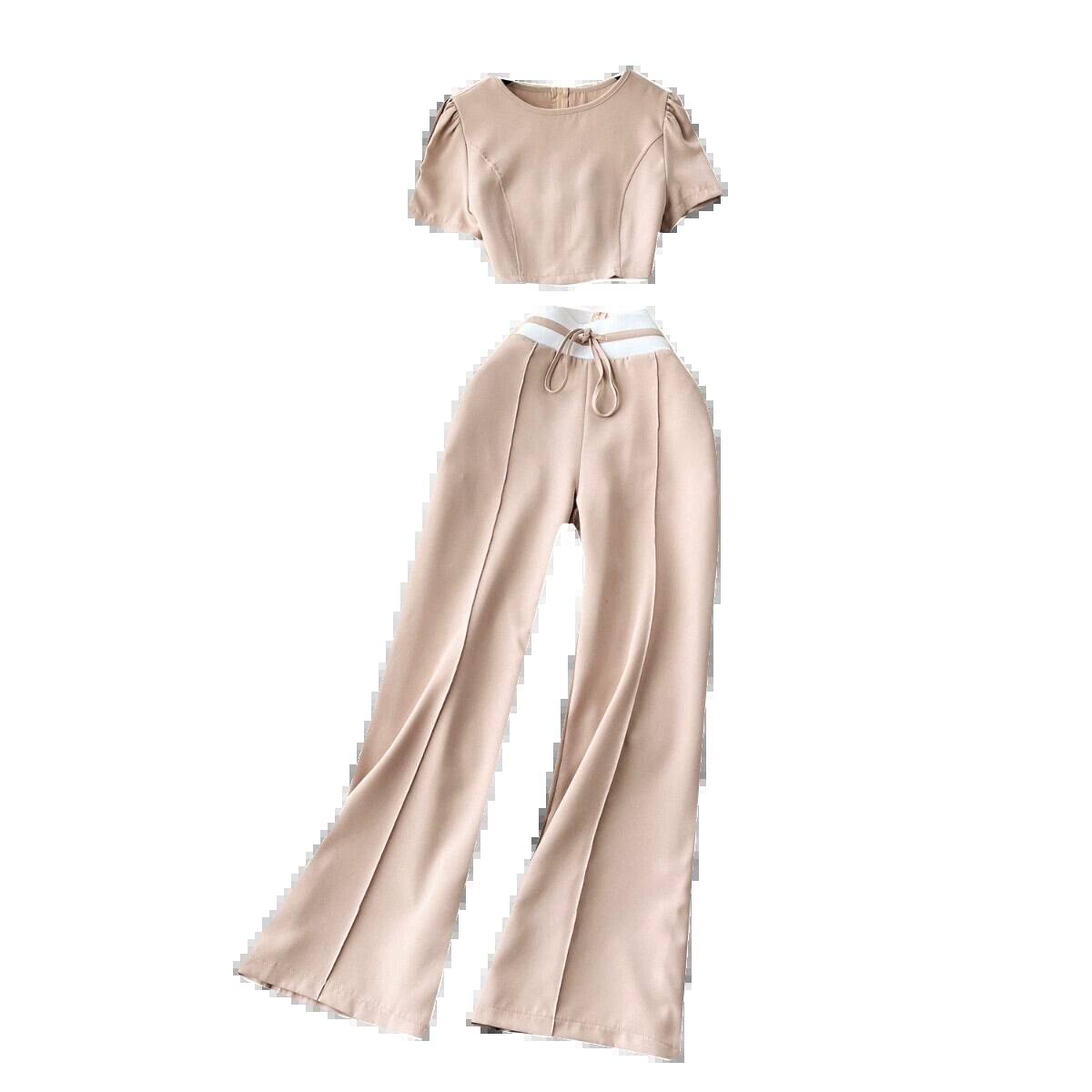 スーツの女性、カジュアルスタイル、ラウンドネック、パフスリーブ、ショートトップ+ドローストリング、ハイウエスト、ルーズワイドレッグパンツ ハイウェスト Oネック ワイドパンツ lyxaj41840937142