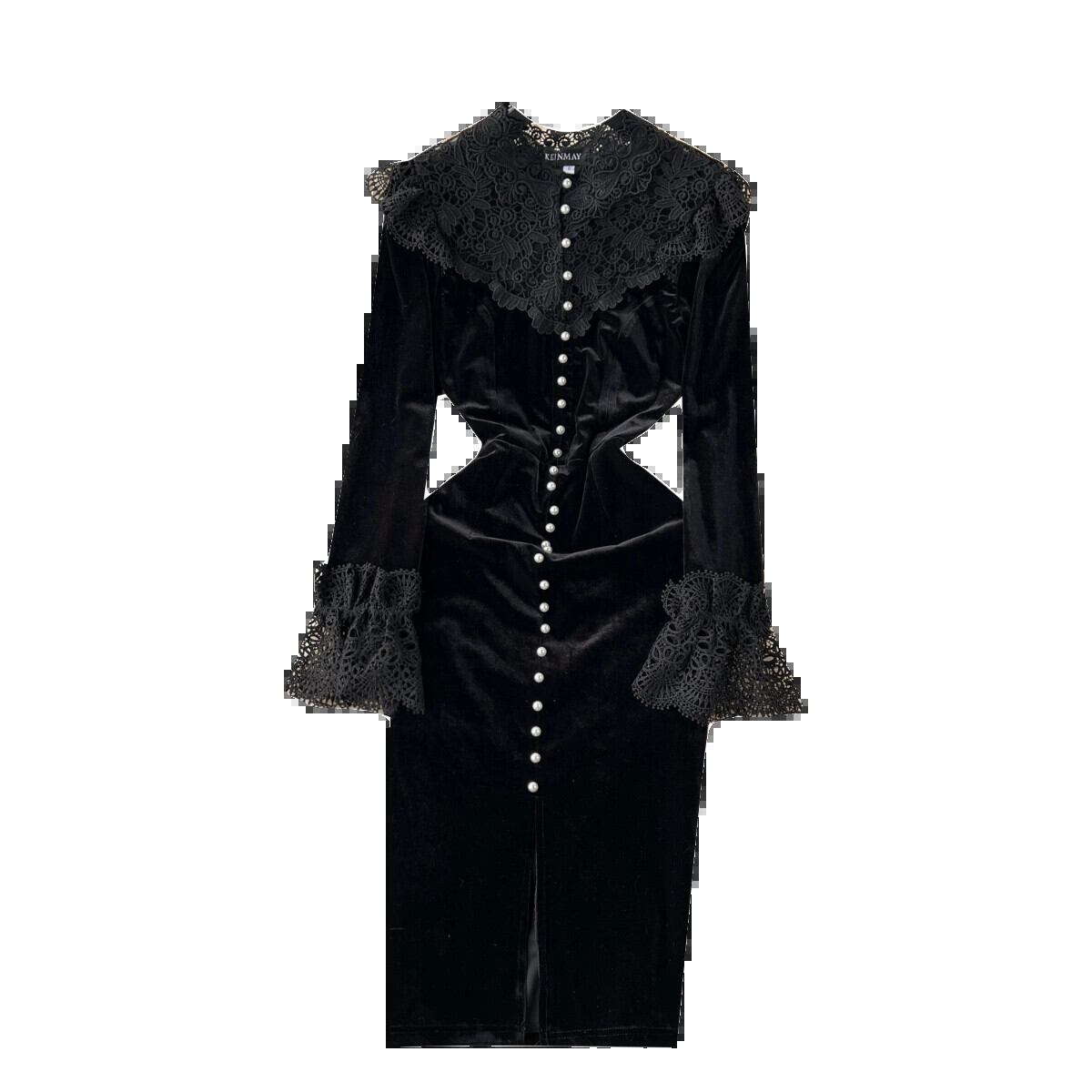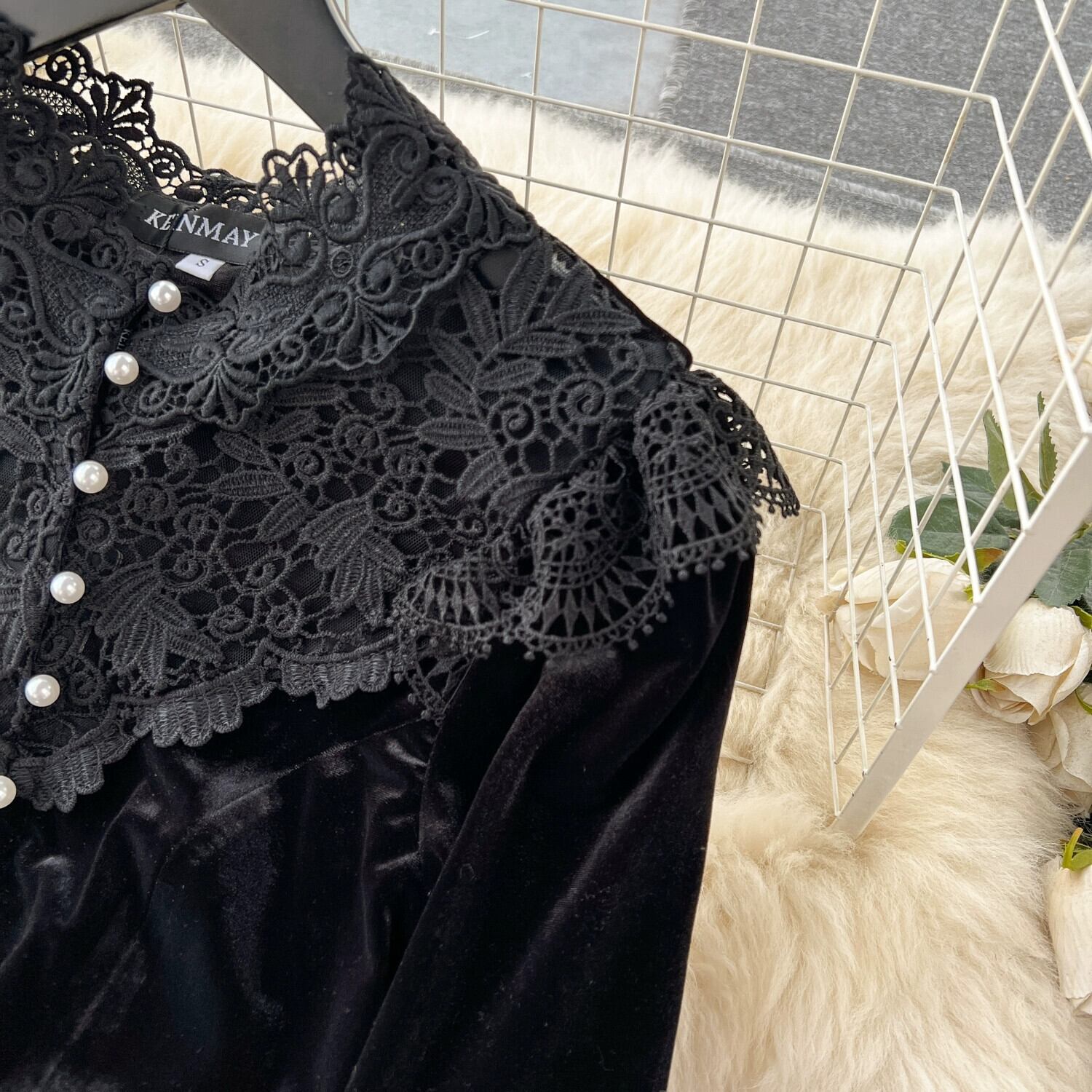 ヘップバーンスタイルのハイエンドゴールドベルベットドレス女性フレンチレトロレーススプライシングシングルブレストスリムヒップハグロングスカート lyxaj10512600485
