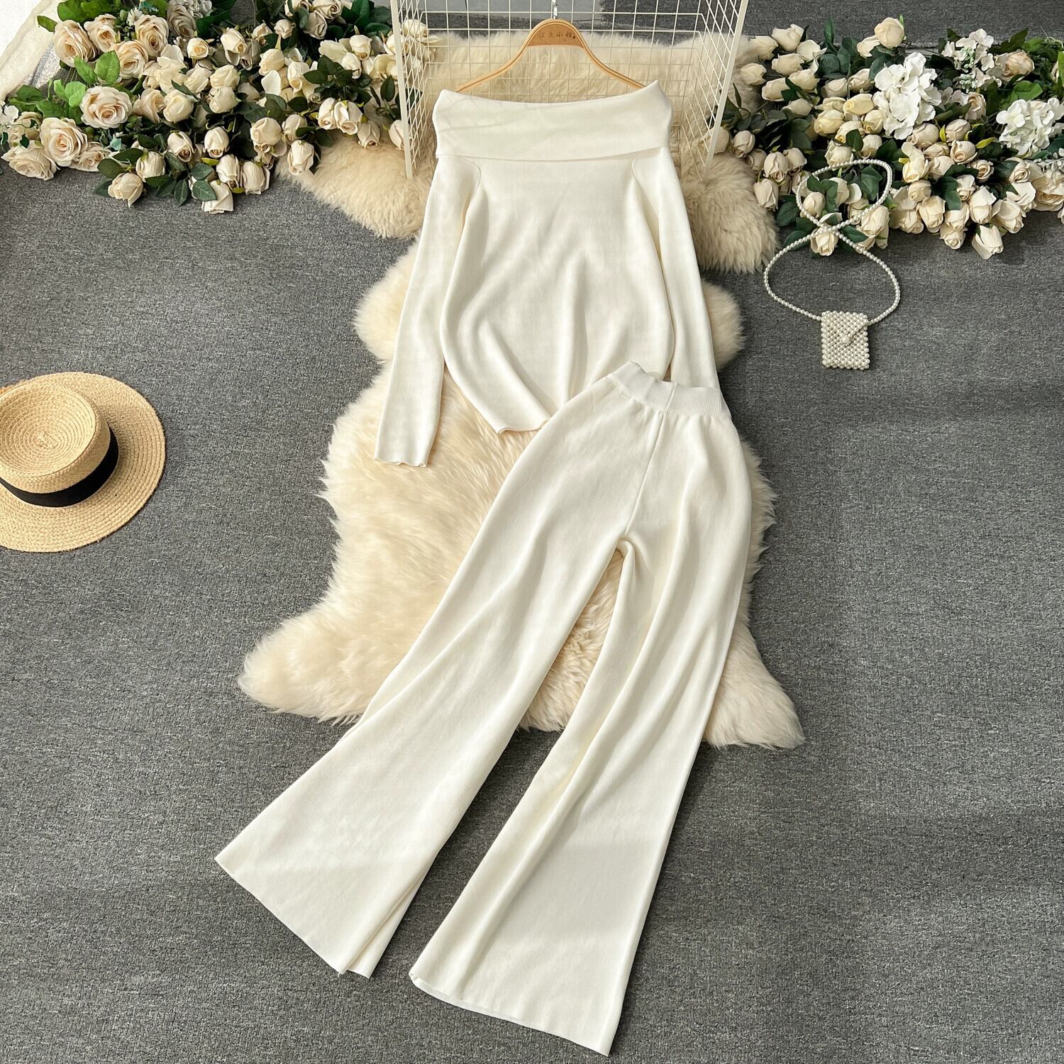 優しいスタイルのワンショルダー長袖セーターレディースセーターツーピーススーツハイウエストスリムカジュアルパンツスーツ ロング lyxaj58305991085