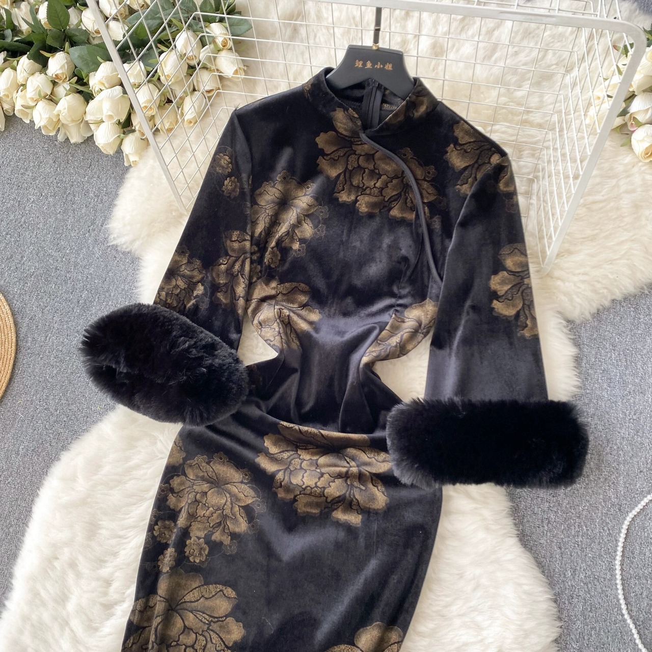 ライトラグジュアリーとハイエンドの新しい中国風プリントチャイナドレス女性の冬の豪華な袖デザインニッチセレブレトロロングドレス ウィンター 冬物 lyxaj98481251867