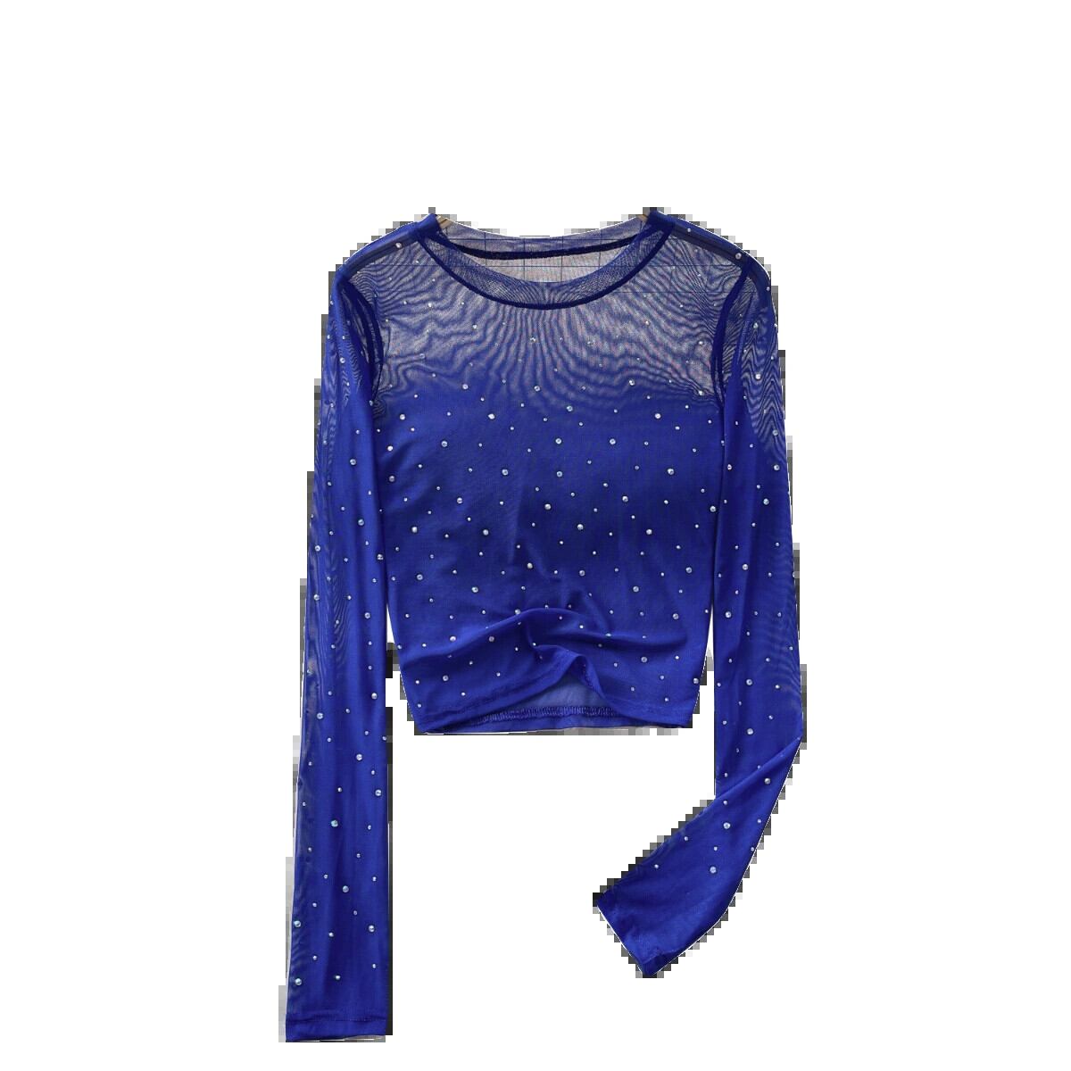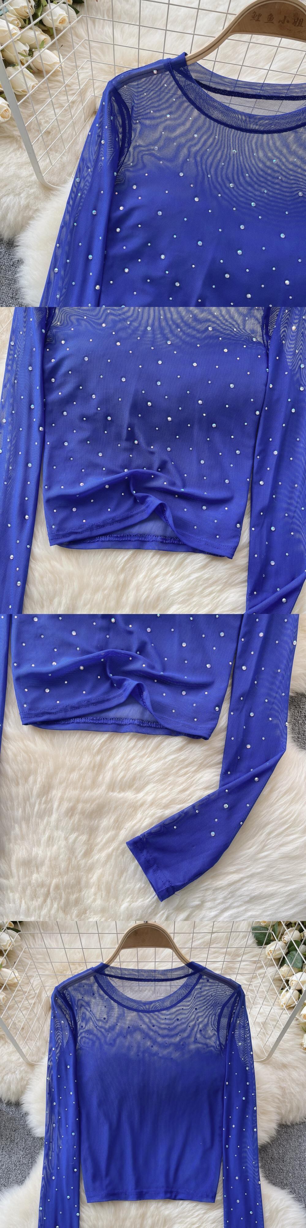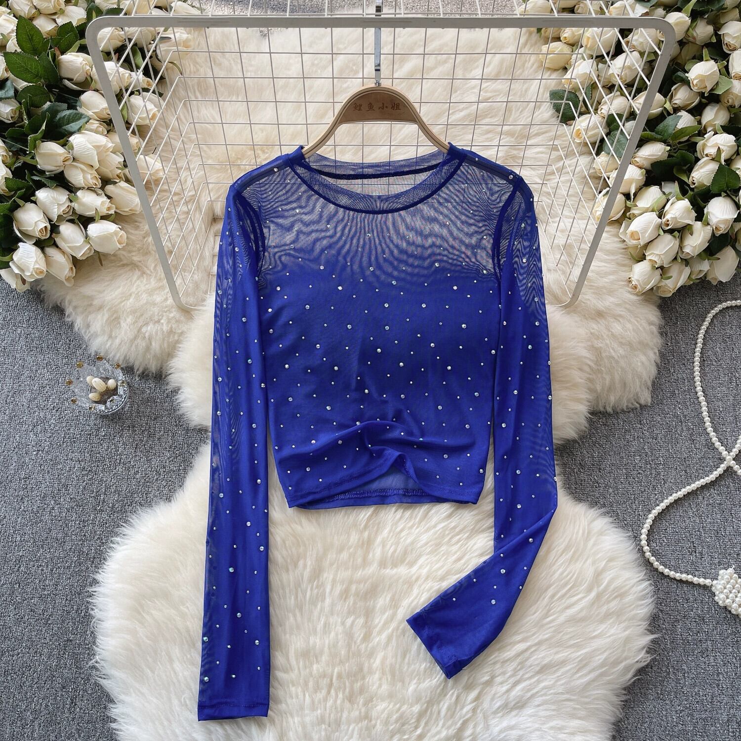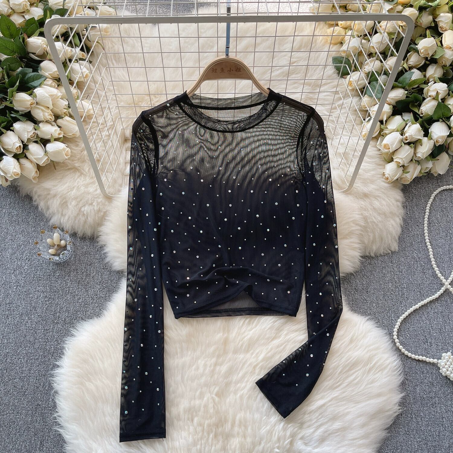 ヨーロッパとアメリカのイン長袖ラインストーンメッシュトップス女性ニッチシックな純粋な欲望ネクタイセクシーなシースルーインナーボトリングシャツ ロング ピュア ヨーロピアン lyxaj40512971361