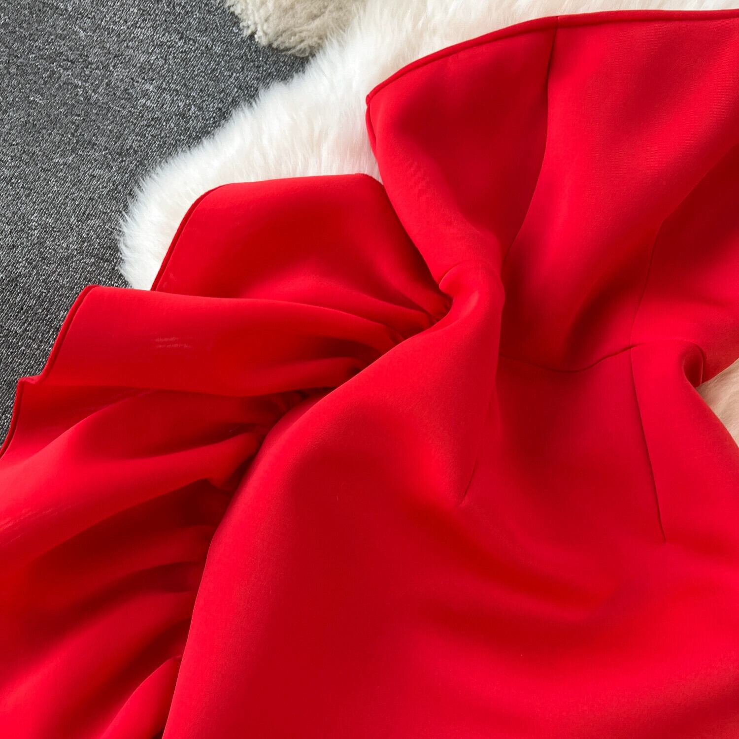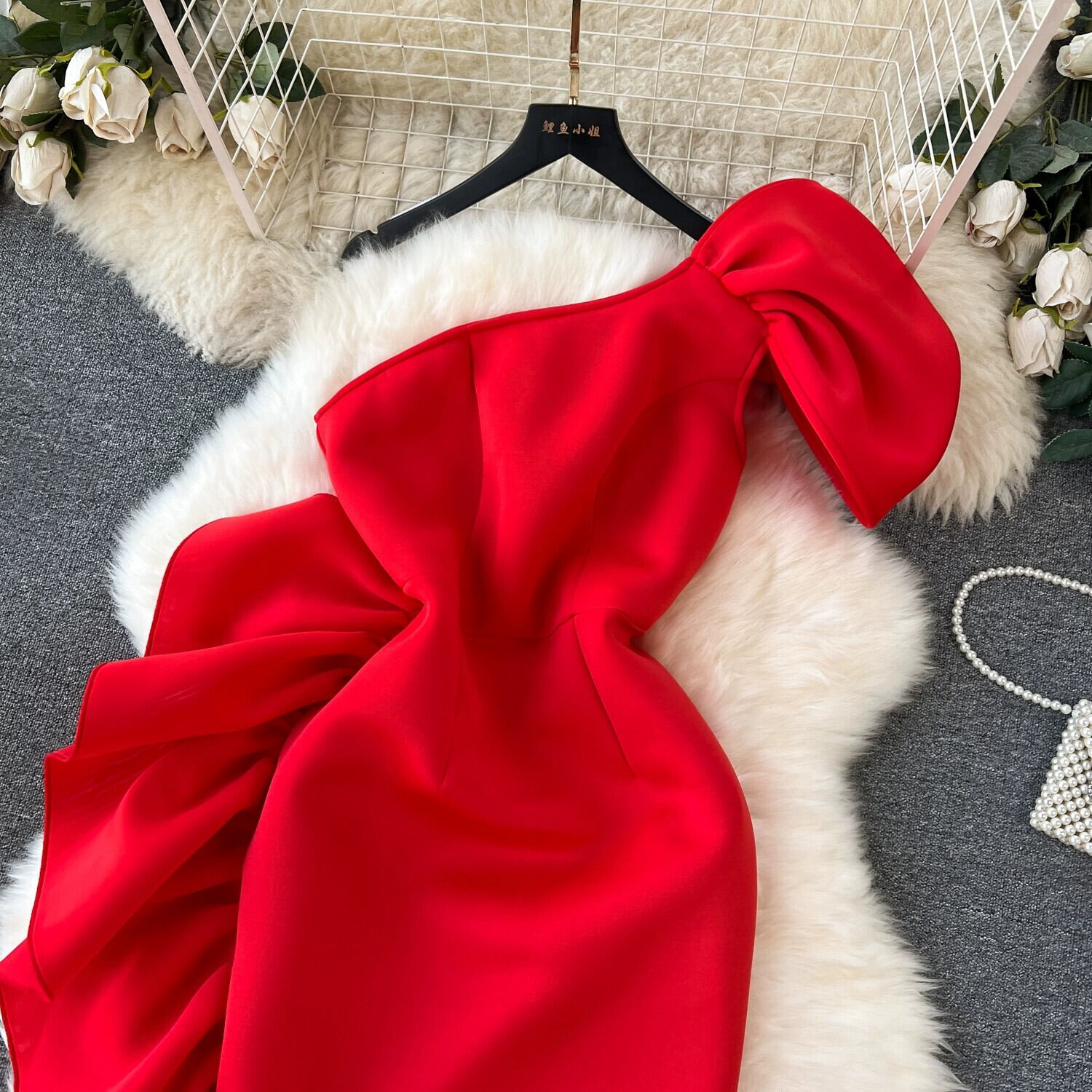 赤いドレスの女性フレンチニッチハイエンド斜め襟オフショルダーフリルパッチワークウエストエレガントなドレス レッド lyxaj37689767332