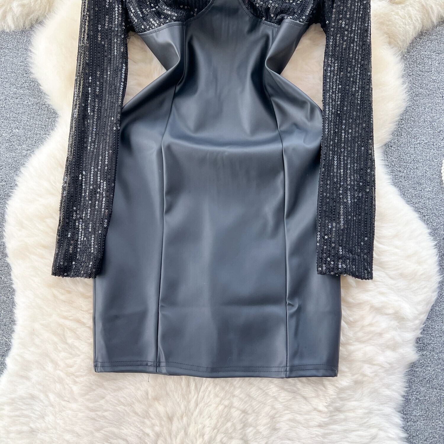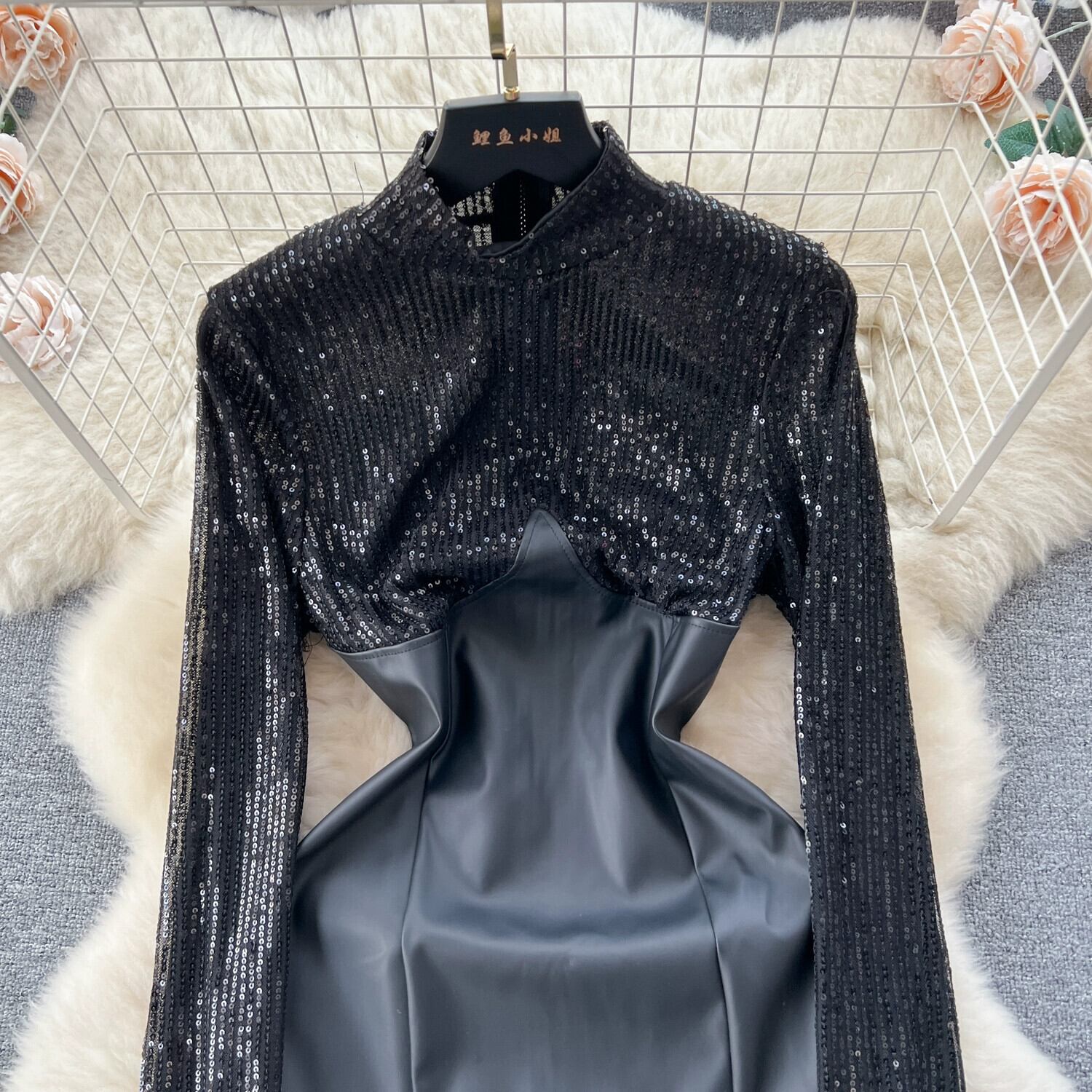 重工業スパンコールスプライシングレザードレス女性の秋冬 2023 新しいスタイルのハイエンドウエストを締める気質セレブドレススカート オータム 秋物 ウィンター 冬物 lyxaj76750471650