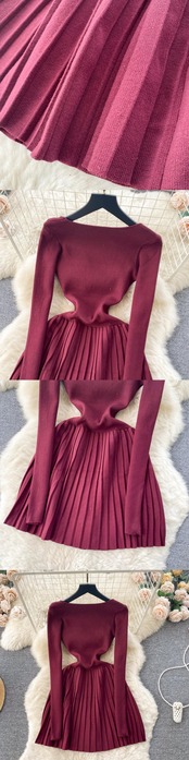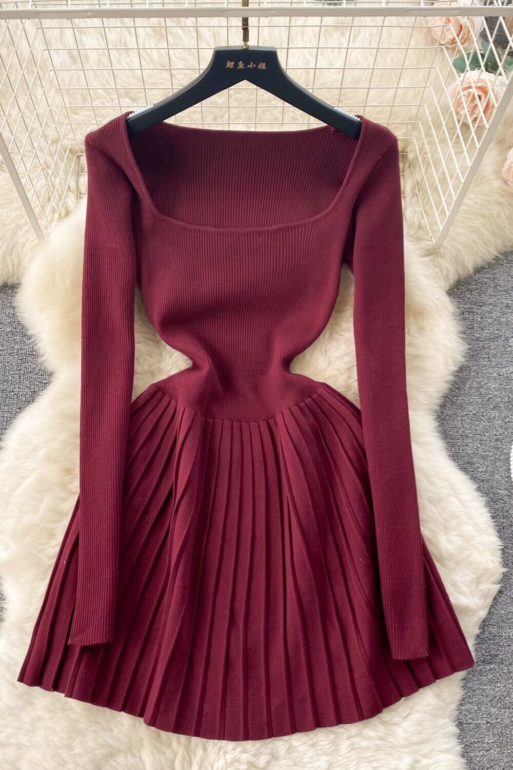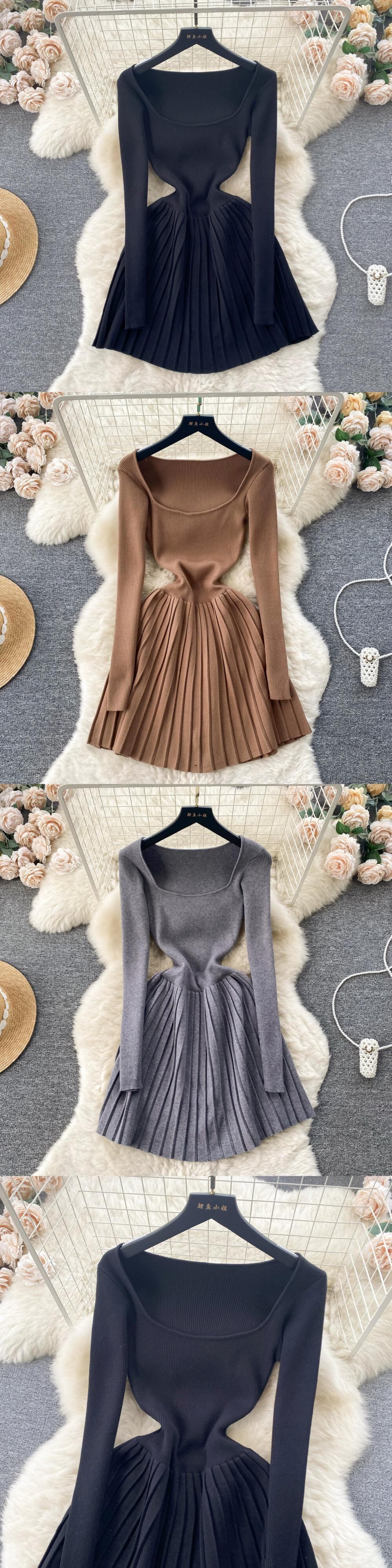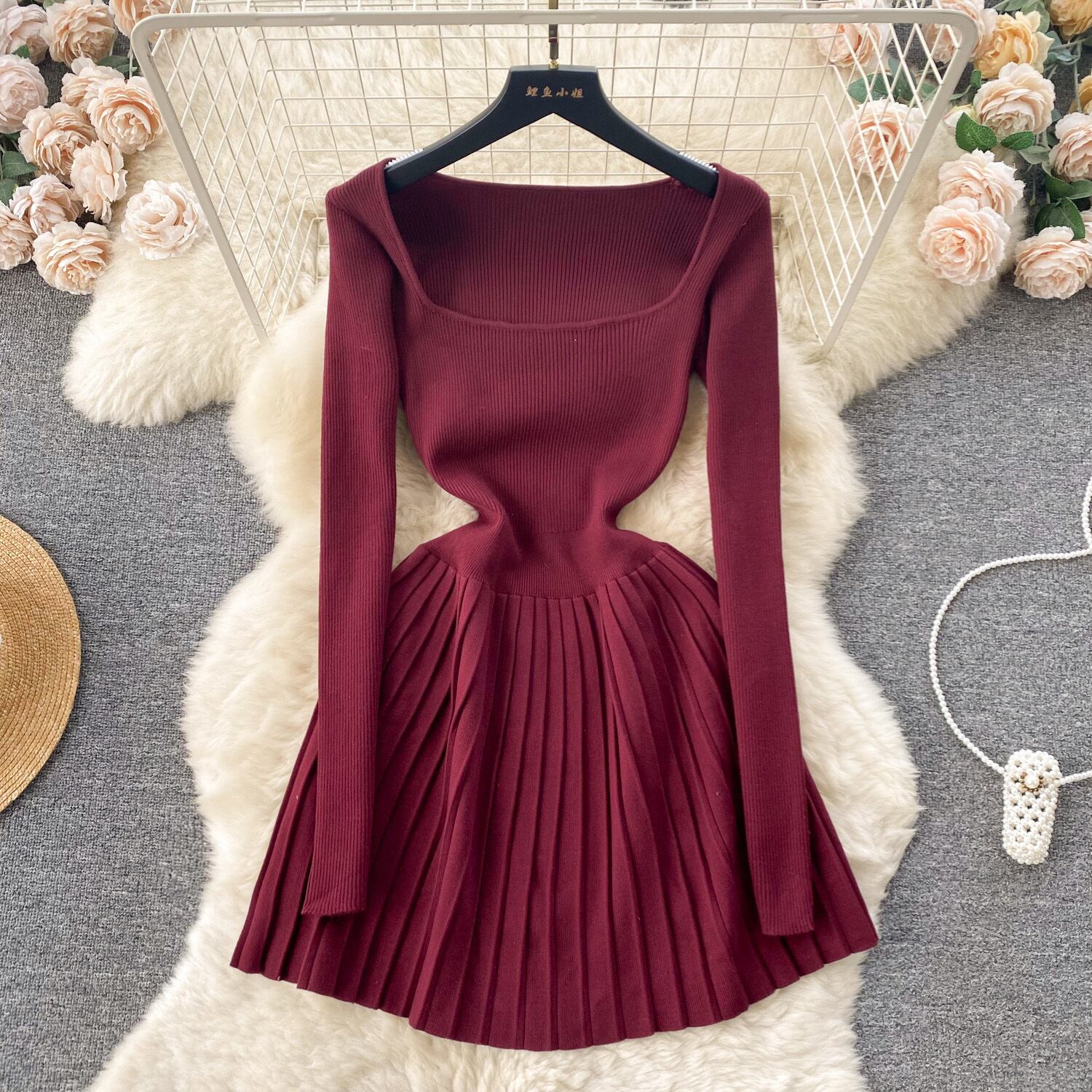 フレンチニットドレス、フェミニンなスクエアカラー、鎖骨ウエスト、着痩せインナーセータースカート、エレガントなプリーツプリンセススカート スクウェア lyxaj74824729751