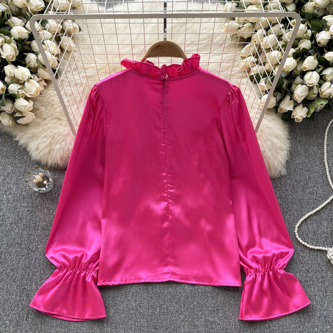 ライトラグジュアリーレディスタイルハイエンドランタンスリーブシャツ女性立体フラワーサテンデザインニッチロイヤルレディ気質トップ フラワーデザイン lyxaj72971809799