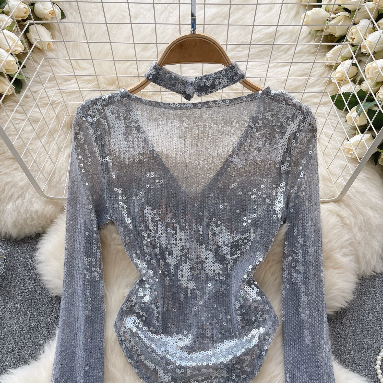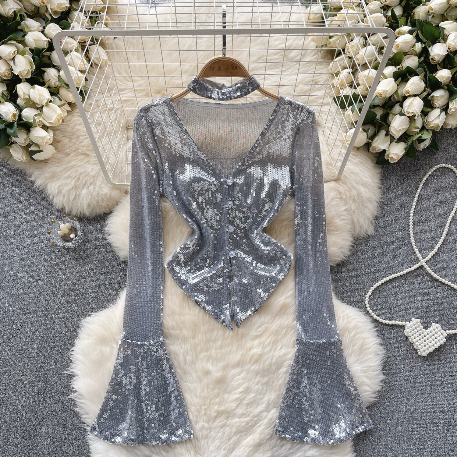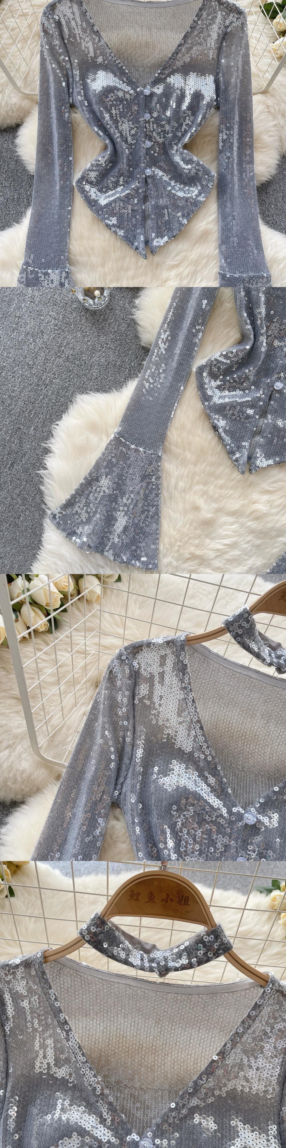 ドーパミン純粋な欲望ホットガールスタイルベルスリーブカーディガン女性の V ネックスパンコールニッチへそ露出ニッチトップトレンディ Vネック ピュア lyxaj75258562575