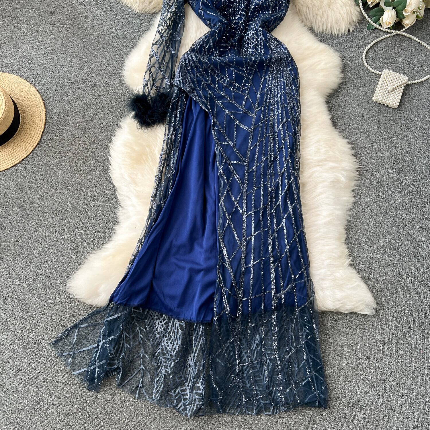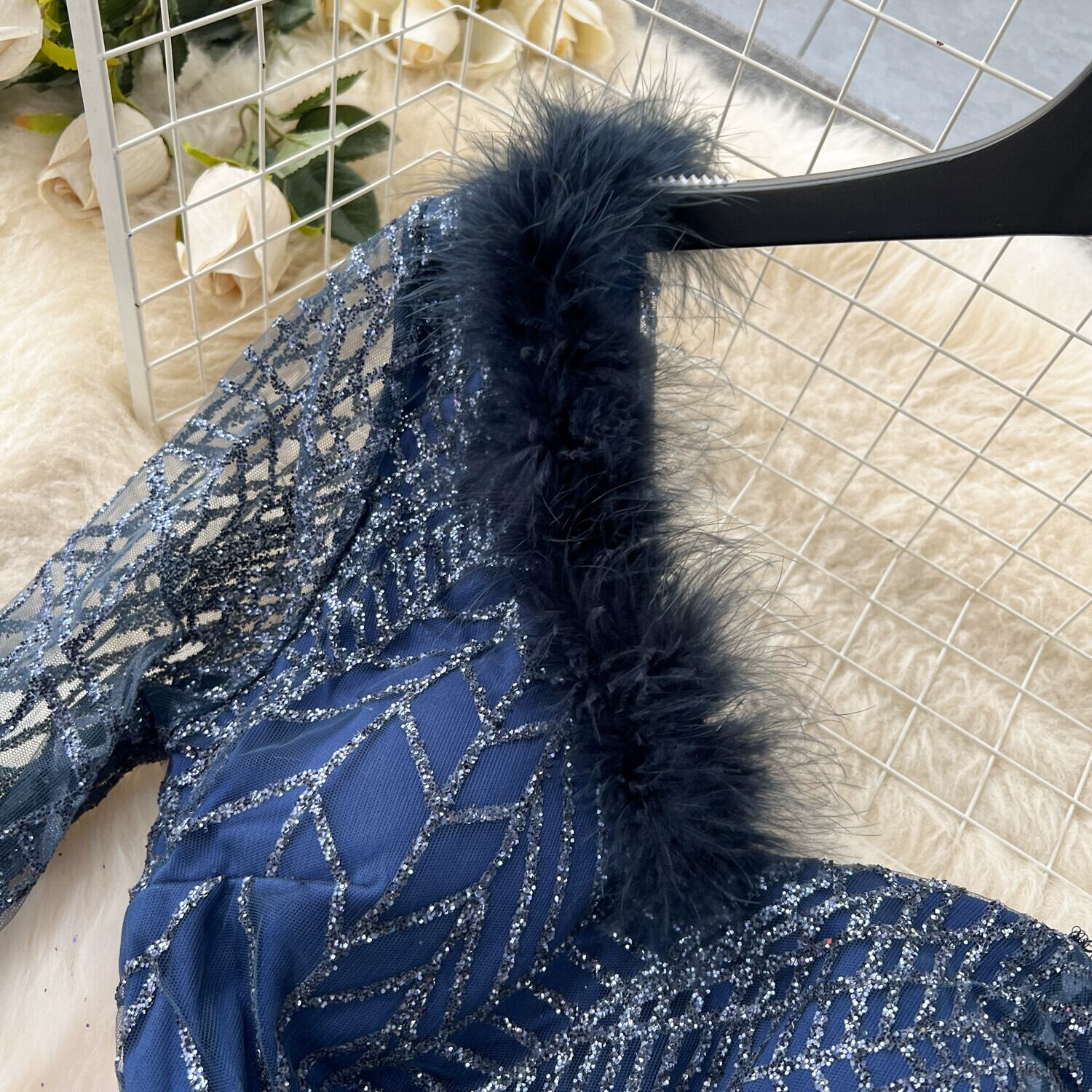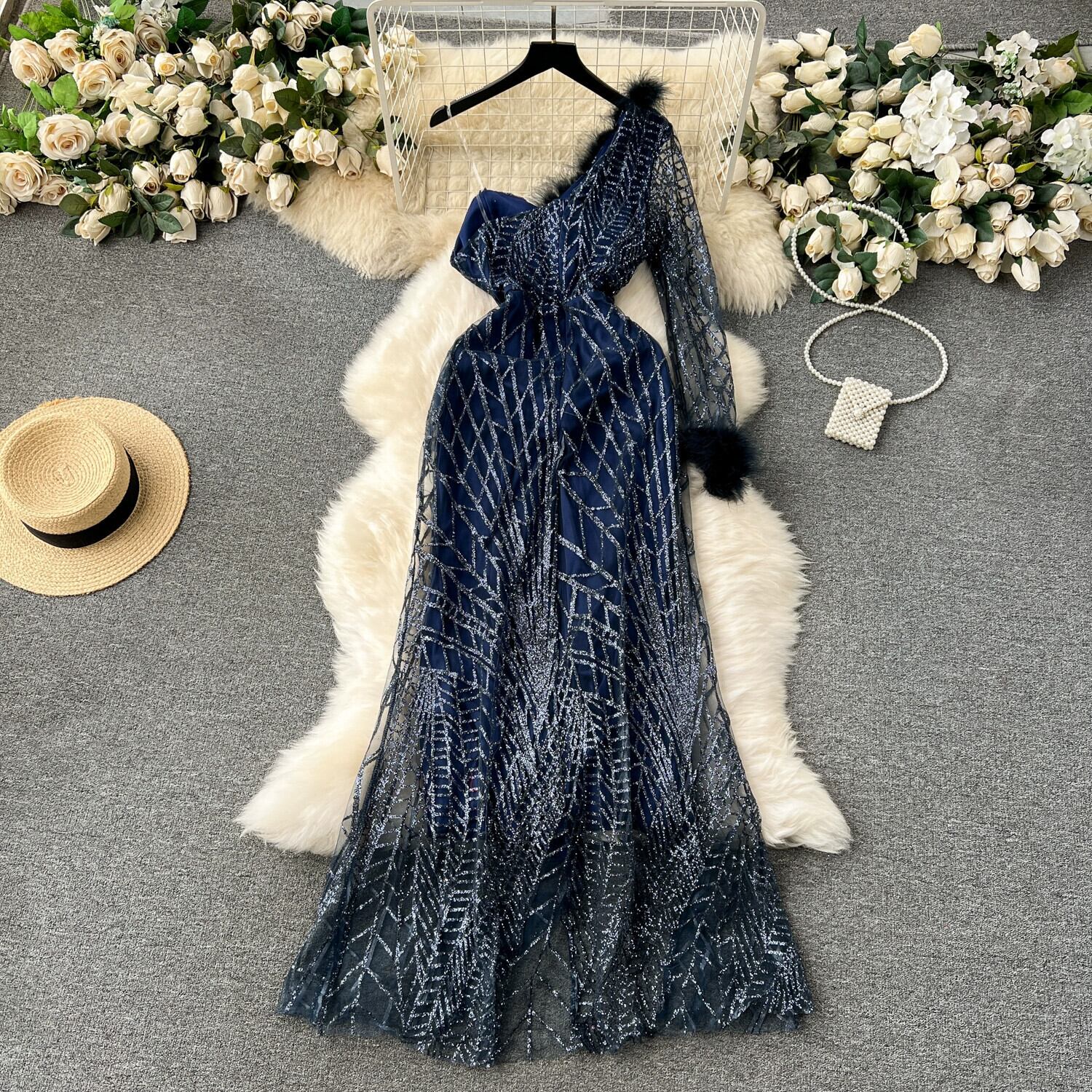 オフショルダードレス女性ヨーロッパとアメリカのインロイヤルシスターハイエンドフェザースプライシングスパンコールスリムロングイブニングドレス ヨーロピアン lyxaj24672977017