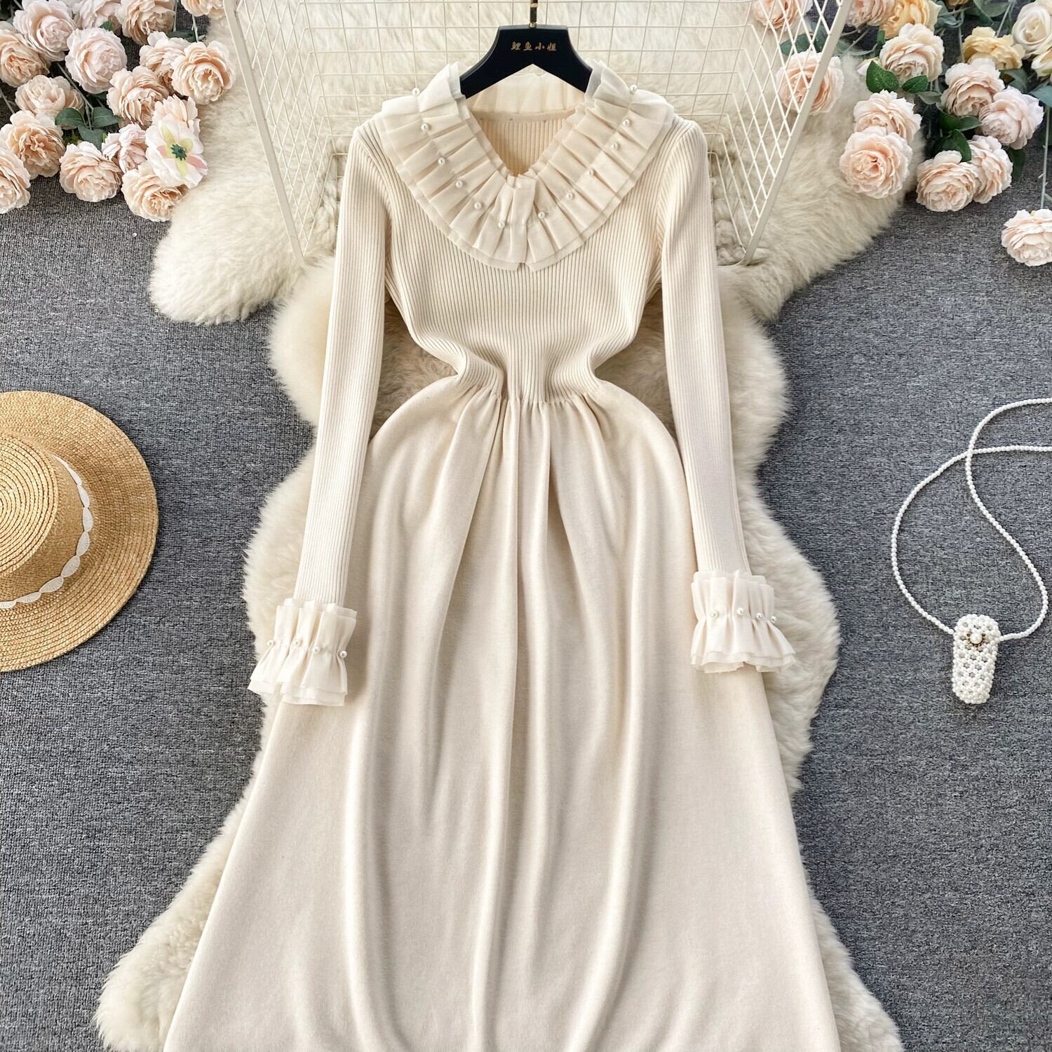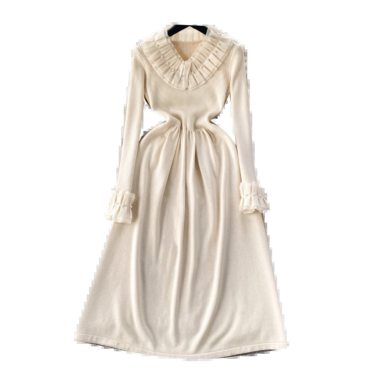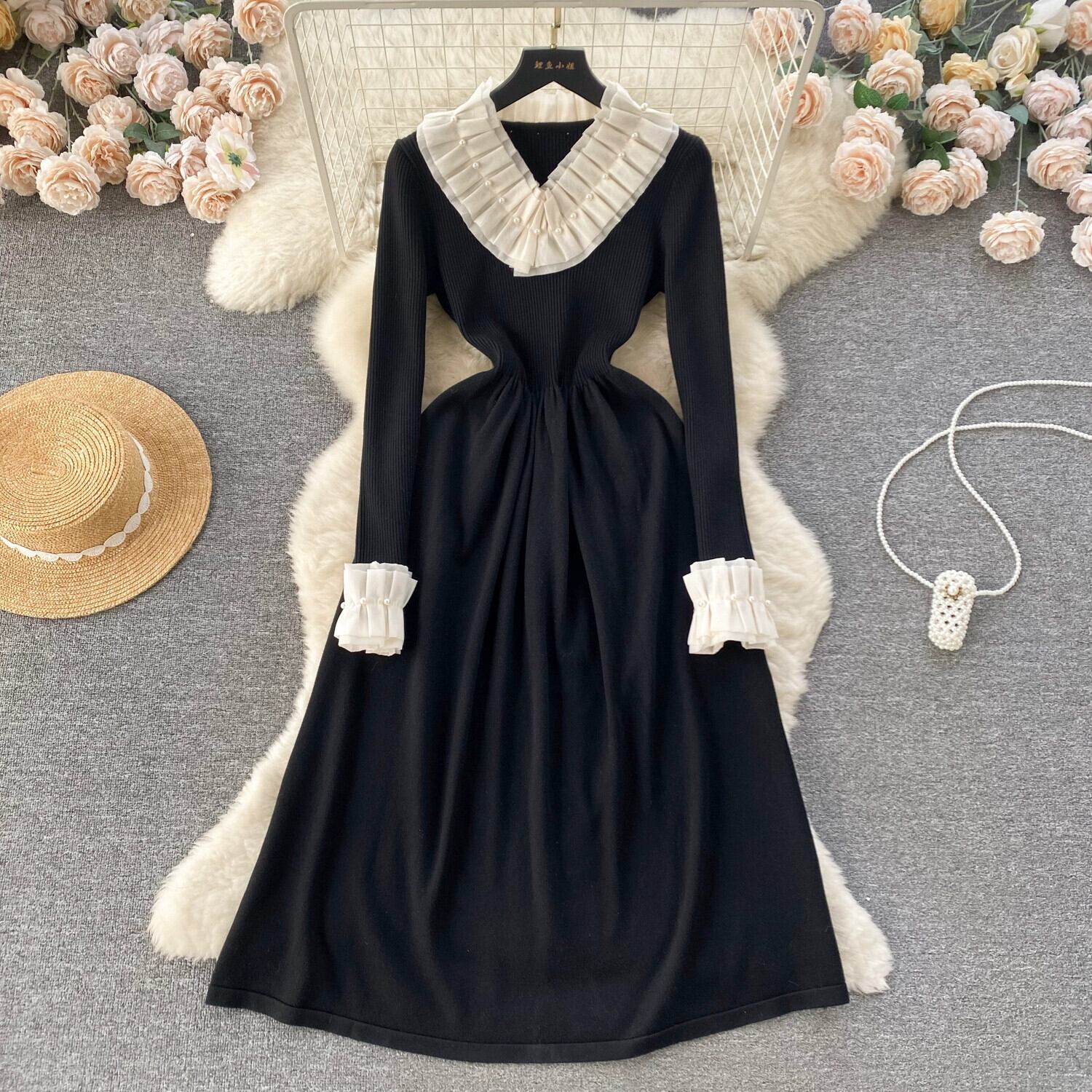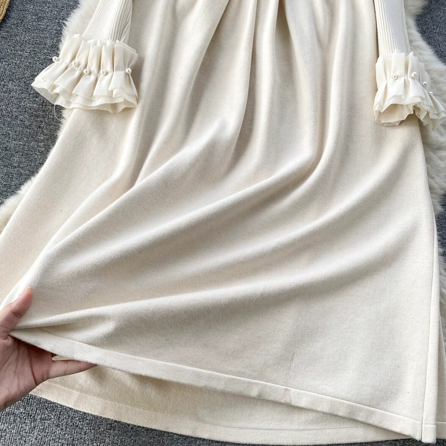 秋冬のフランスの優しいスタイルのドレス女性、丈夫なプリーツ、ビーズ、フリル、スプライスニットのミドル丈スカート、ボトミングスカート オータム 秋物 ウィンター 冬物 lyxaj91366865590