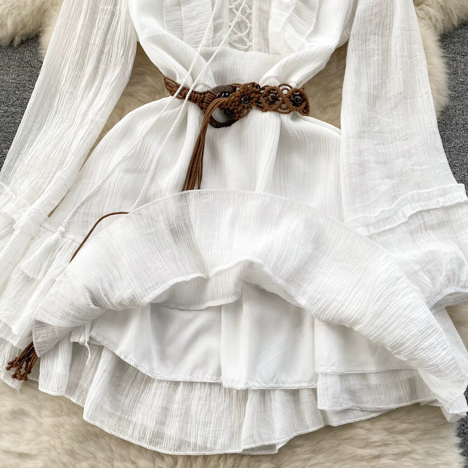 2024 春の新リゾートスタイル甘い菌ストラップスリムショートフリルドレス女性 大人ガーリー スウィート キュート カジュアル スプリング 春物 lyxaj17635627914