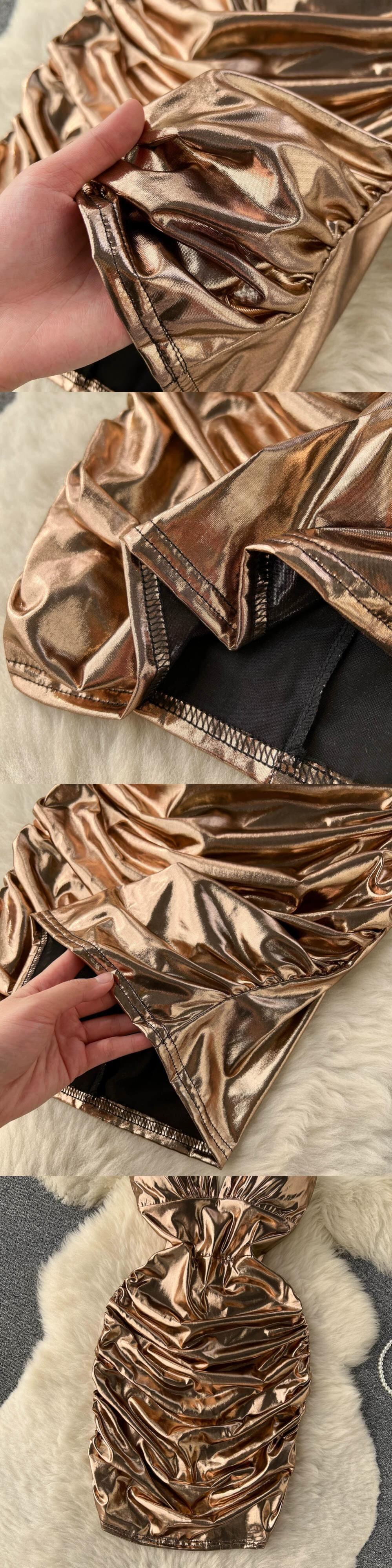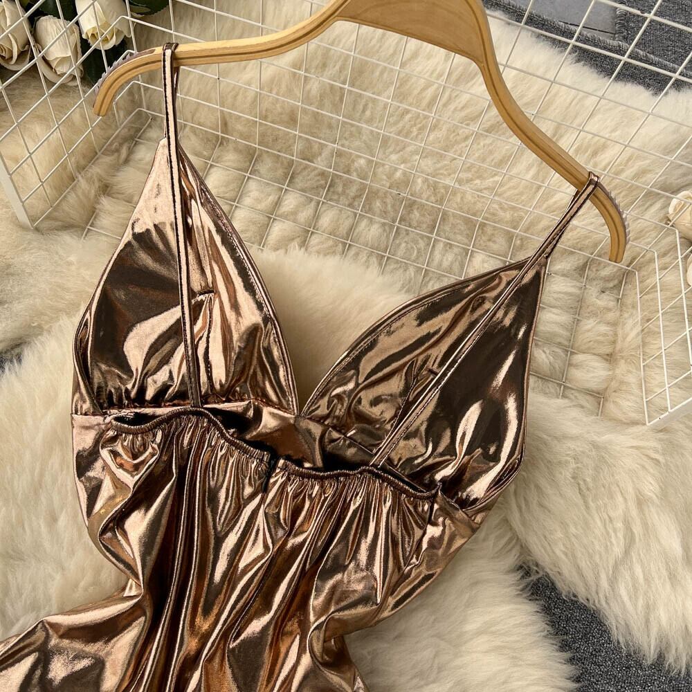 夏の新しいセクシーな背中の開いたホルターネックチューブトップサスペンダードレス女性のウエストプリーツミッドレングスサテンヒップスカート サマー 夏物 lyxaj39177889896