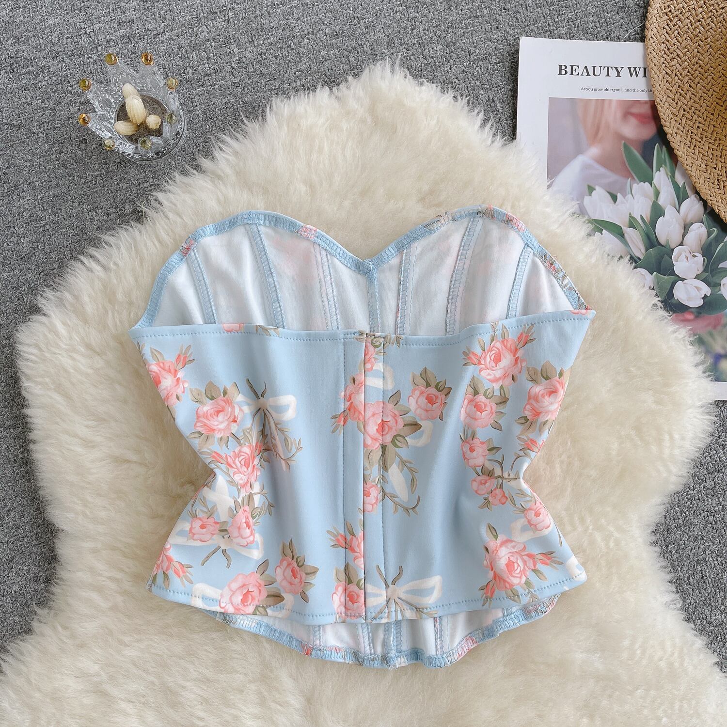 セクシーな純粋な欲望ネクタイスタイルチューブトップ背中の開いたフラワープリントトップ女性の夏スリムフィットショートフィッシュボーンウエストベスト サマー 夏物 ピュア フラワーデザイン lyxaj43762127495