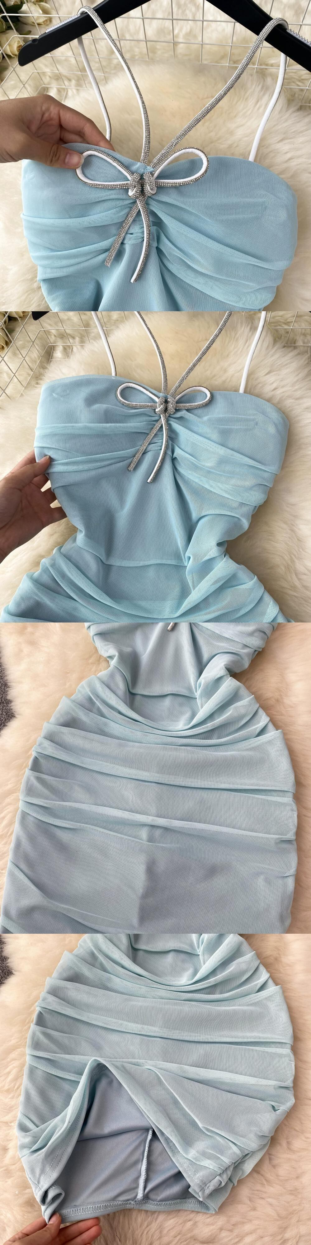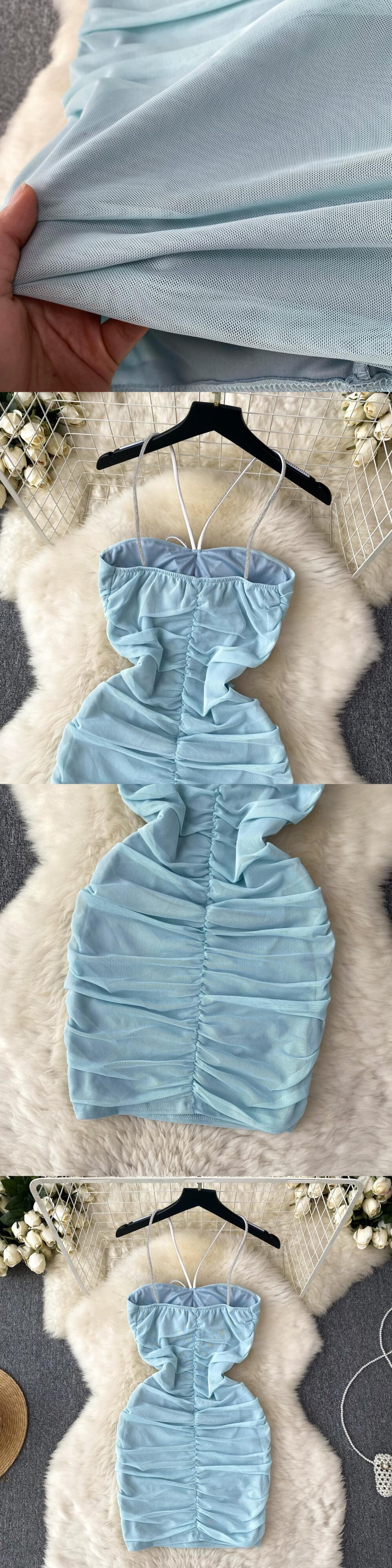 アメリカン スタイルの純粋な欲望ネクタイ チューブ トップ ホルター ネック サスペンダー ドレス女性の夏プリーツ タイトなヒップ抱きメッシュ ショート スカート サマー 夏物 ピュア lyxaj14229195743