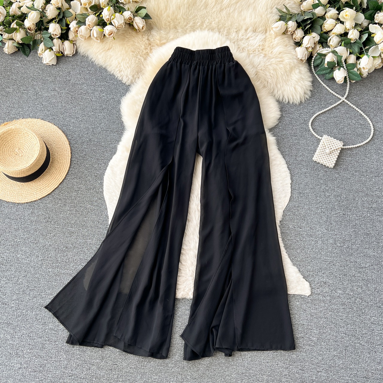 国民的トレンディなレトロ文学チュールパンツの夏の女性は、スリットハイウエストと伸縮性のあるデザインのニッチ痩身パンツを備えています ハイウェスト エラスティック サマー 夏物 lyxaj46568896090