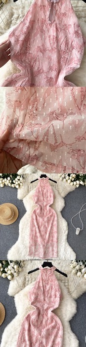 フレンチノースリーブホルターネックチャイナドレスディスクボタンドレス女性の夏スリムフィットスリットプリントヒップスカート サマー 夏物 lyxaj69297228994