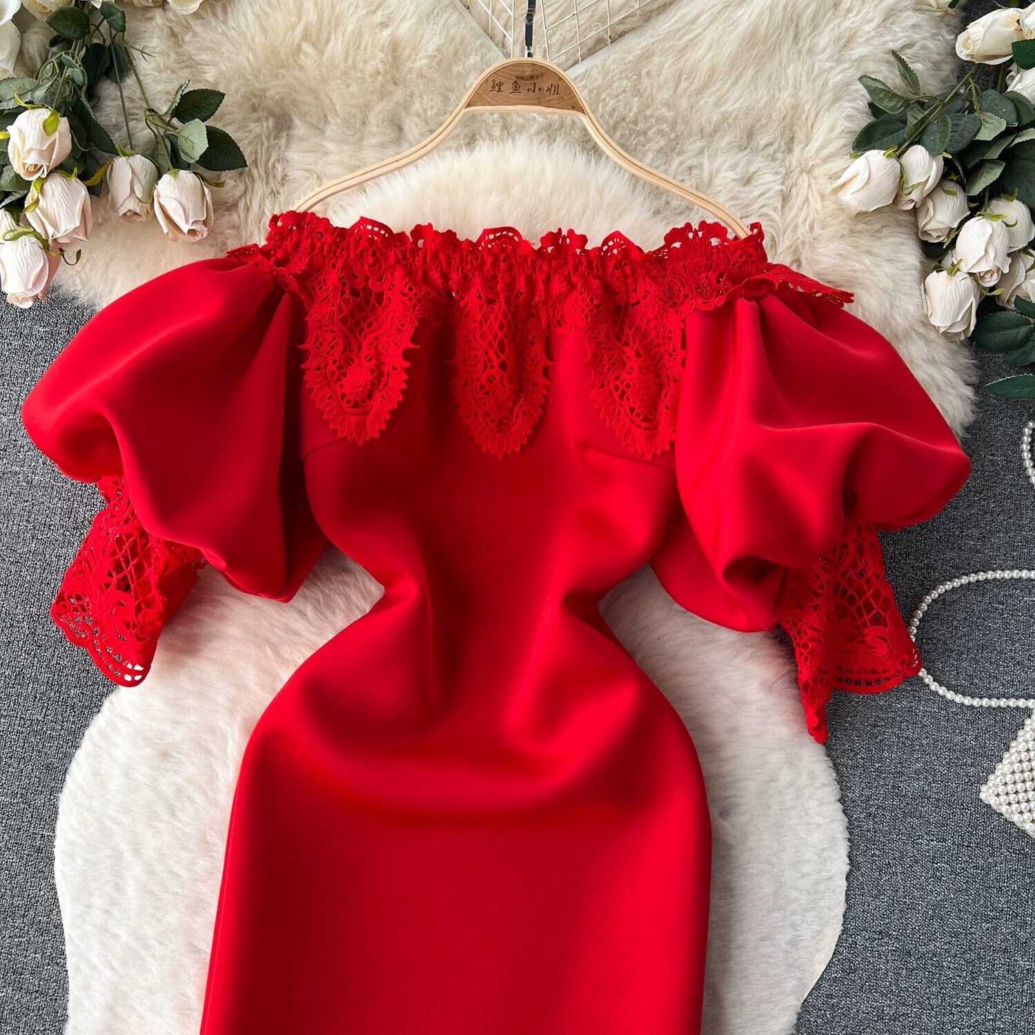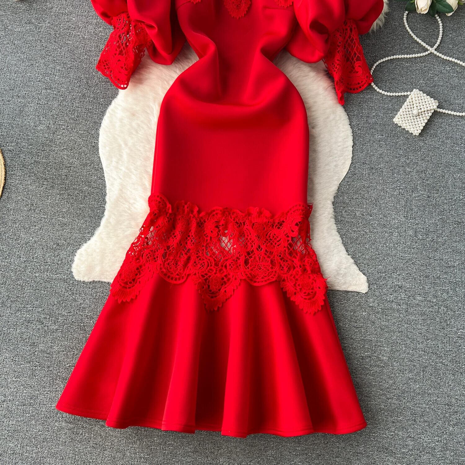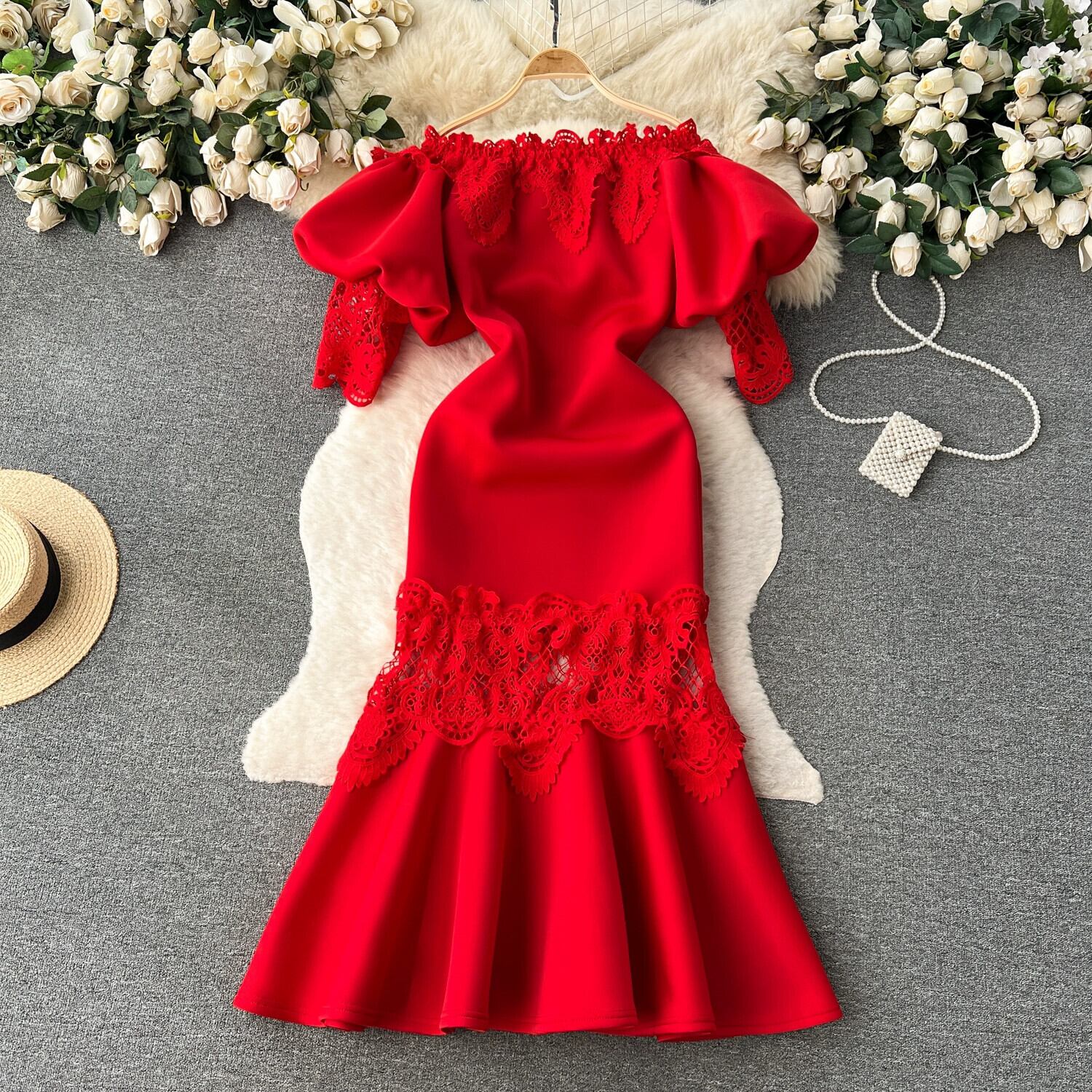 レトロライト高級パーティードレス女性のフレンチワンショルダーパフスリーブレースパッチワークウエストマーメイドドレス lyxaj57191930863