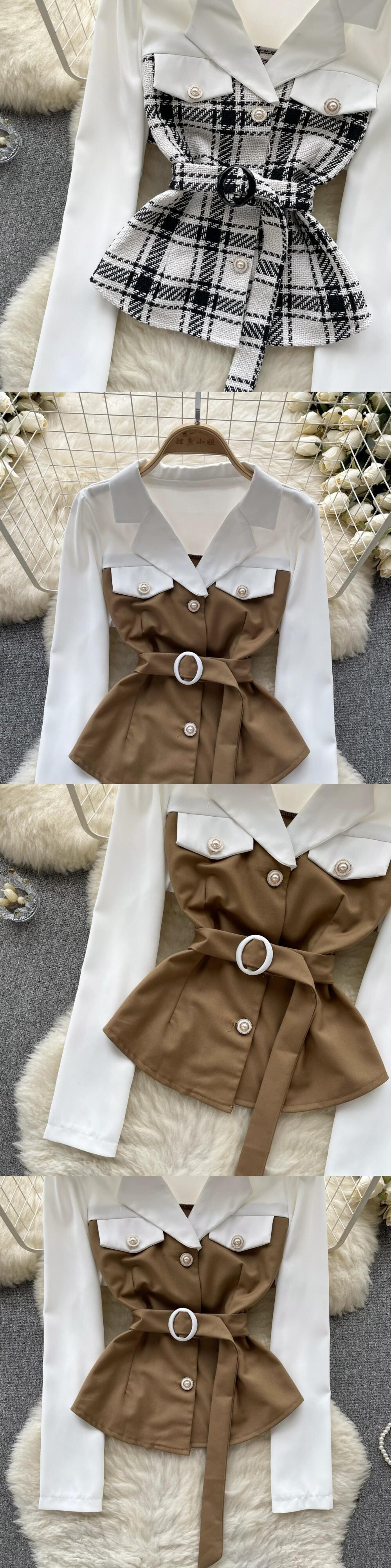 ライトラグジュアリーでハイエンドのフェイクツーピースチェック柄シャツ女性秋カラーブロッキングストラップデザインニッチスーパーフェアリー気質トップ オータム 秋物 lyxaj64112481058
