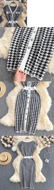 ウエストウエストのレトロな千鳥格子ニットドレス、新しい秋の気質、Vネックボタン付きスリムミッドレングスヒップスカート オータム 秋物 lyxaj325881417