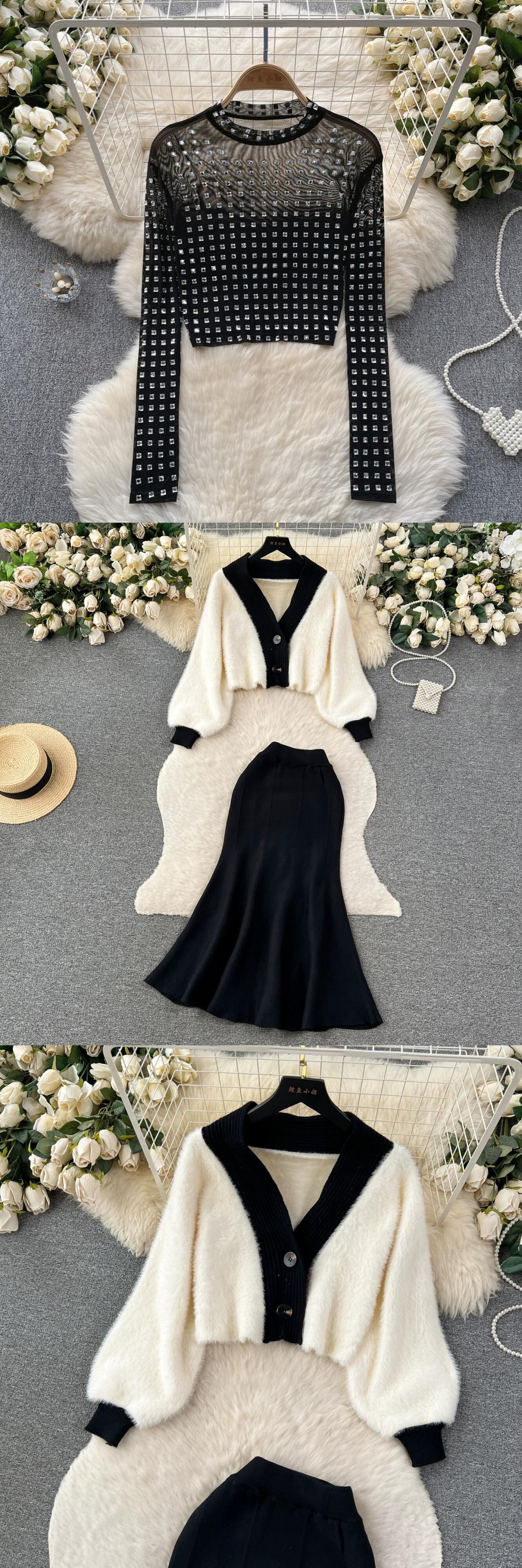 フェミニンな装い、凛としたエレガントなレディーススーツ、ニッチなカラーブロッキングニットカーディガン+フィッシュテールスカートの2点セット lyxaj14352246698