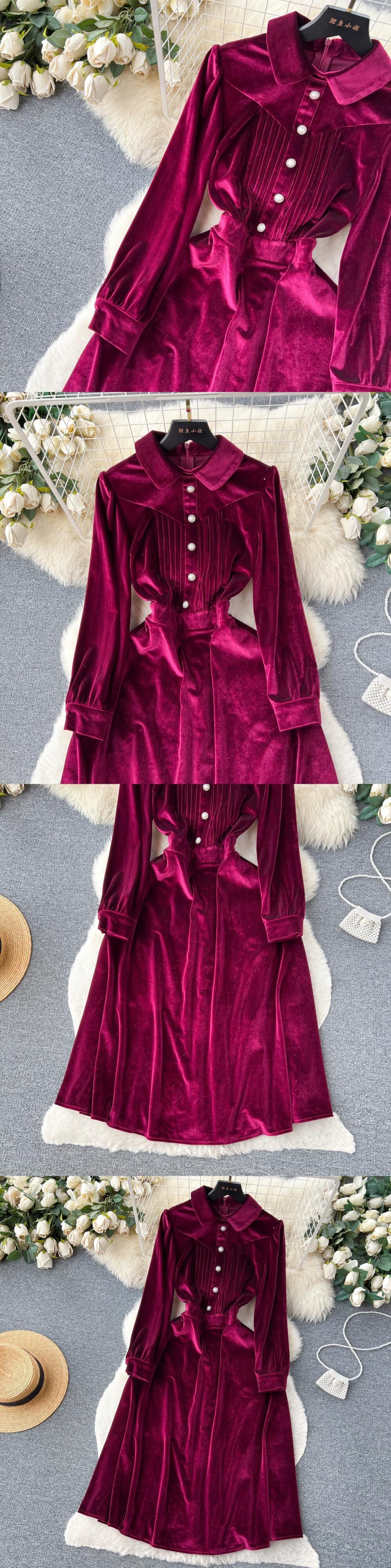 秋の新しいスタイルの長袖ベルベットドレス女性フレンチレトロヘップバーンスタイルラペルシングルブレストウエスト締め付けロングスカート オータム 秋物 lyxaj75250917390