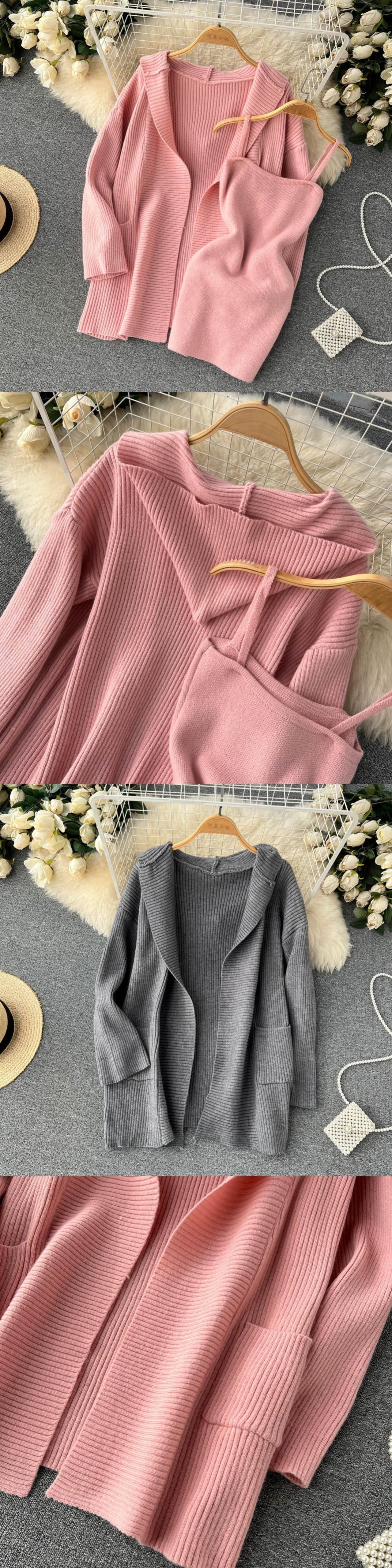 秋と冬の怠惰なスタイルのカジュアルスーツの女性、ゆったりとしたミッドレングスのショールセータージャケット+サスペンダードレスの2点セット オータム 秋物 ウィンター 冬物 lyxaj37229630132