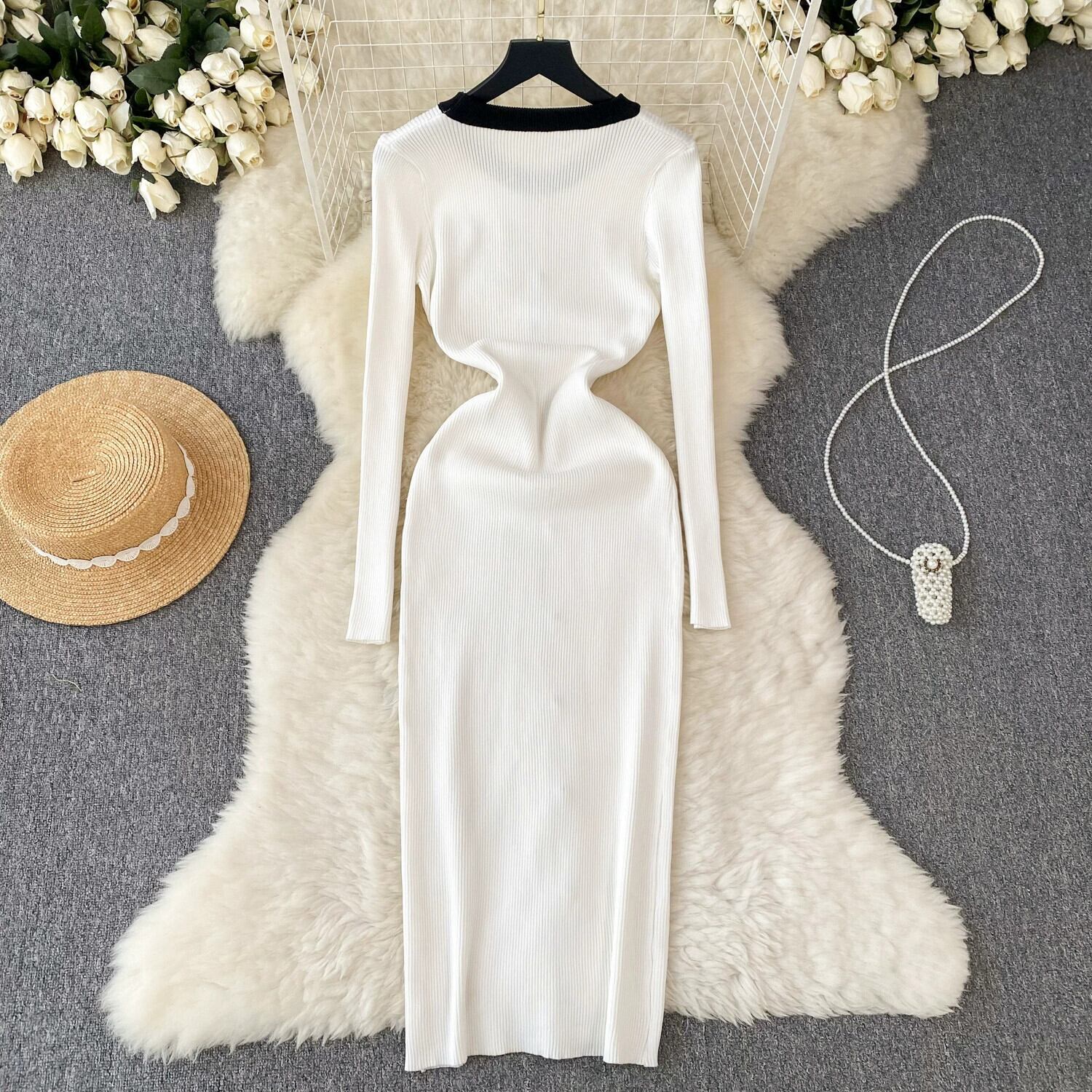 ライトラグジュアリーレディスタイルハイエンドニットドレスレディース秋冬コントラストストライプデザインニッチシックロングスカート オータム 秋物 ウィンター 冬物 lyxaj54581541847