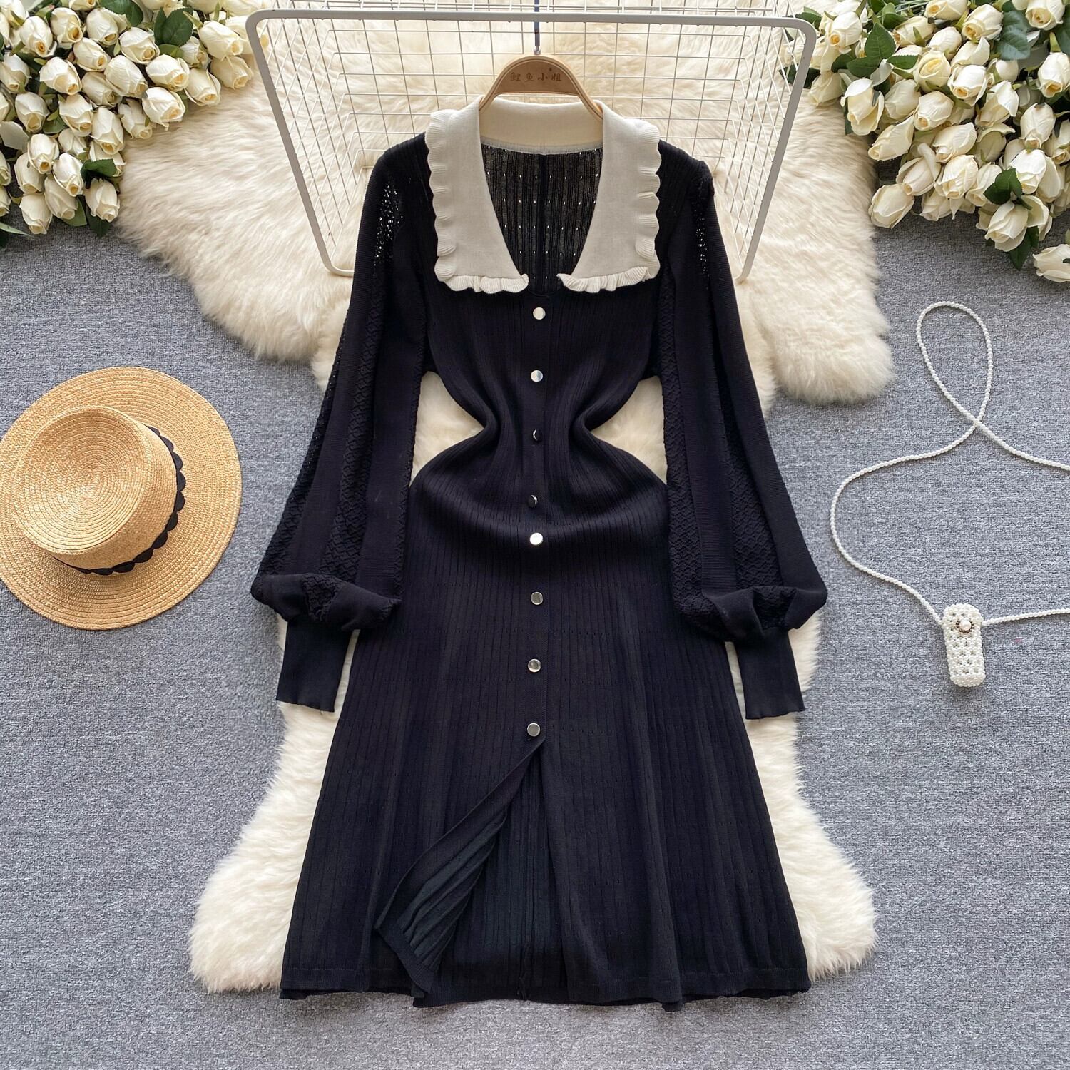 秋冬のフレンチスタイルの高級ニットドレスの女性、ラペルランタンスリーブデザインのスーパーフェアリーロングスカート オータム 秋物 ウィンター 冬物 lyxaj4361676193