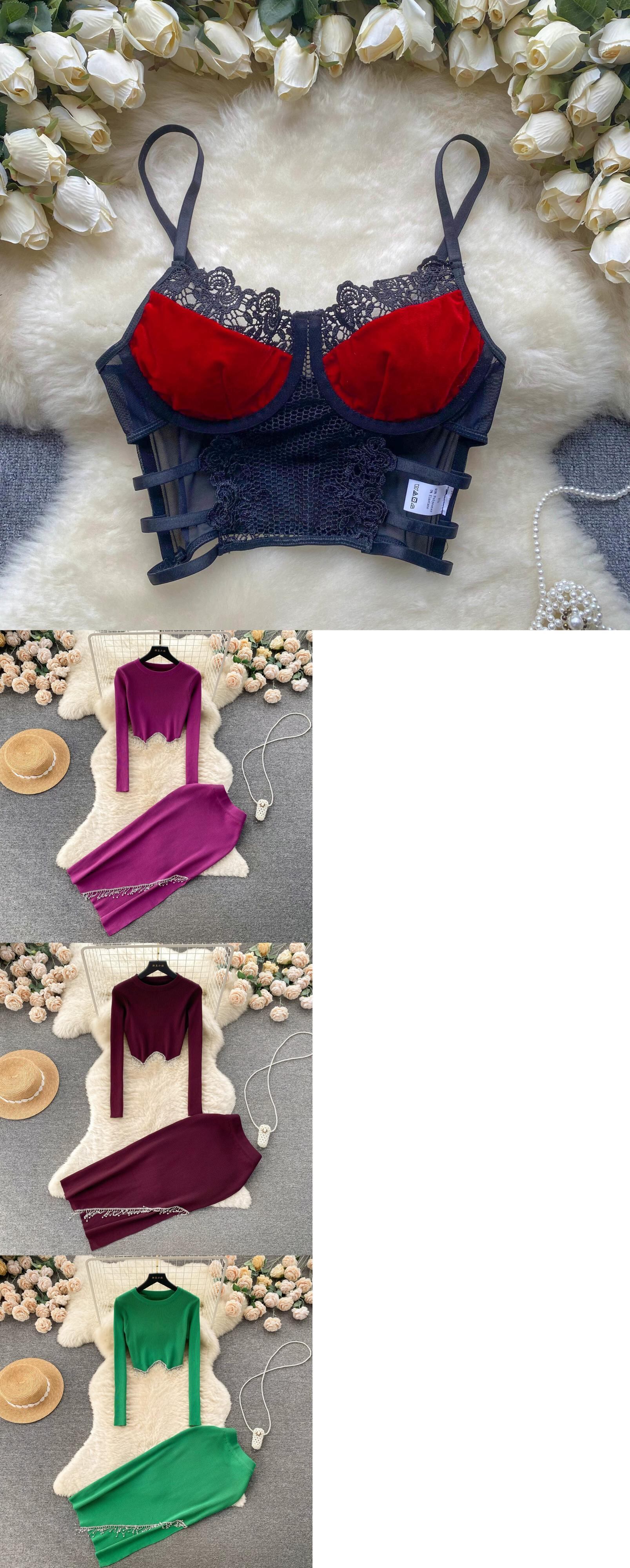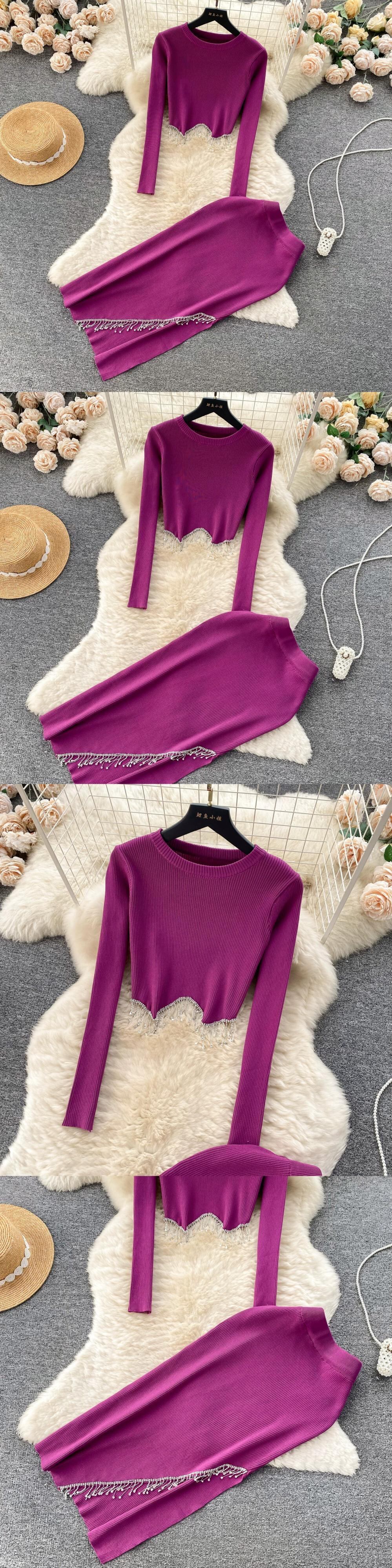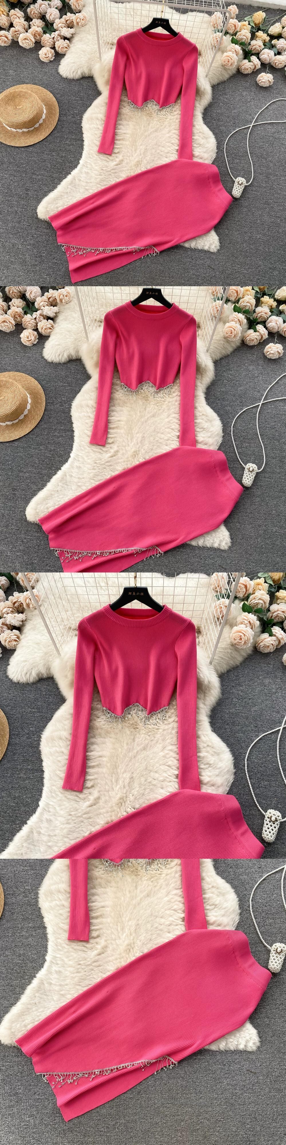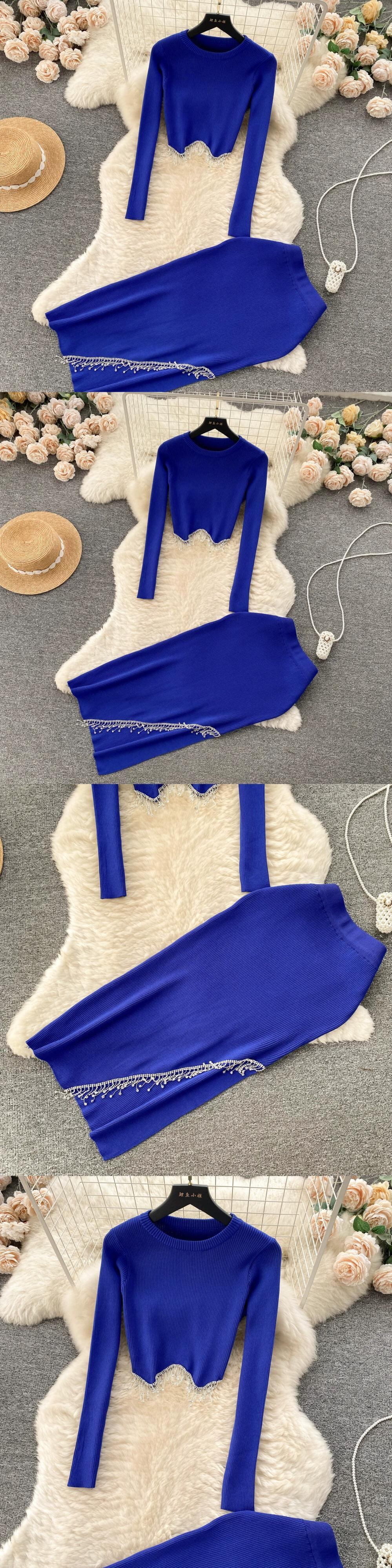 レディスタイルの高級ダイヤモンドがちりばめられたテルスーツの女性、ラウンドネック、ショート、長袖ニットトップ、ヒップカバースリットスカート ロング Oネック lyxaj79999443522