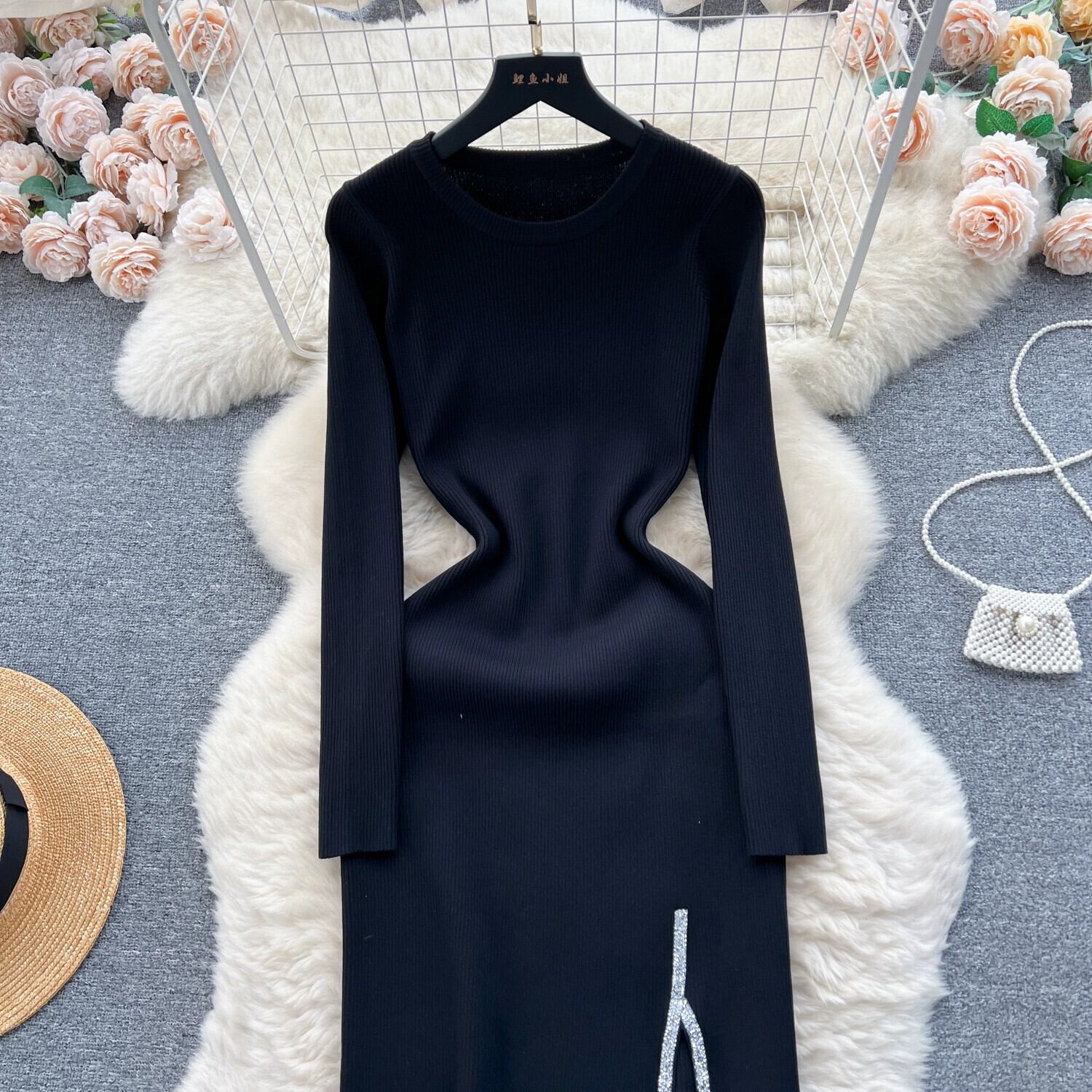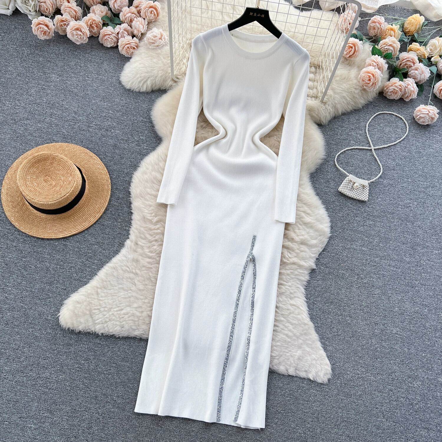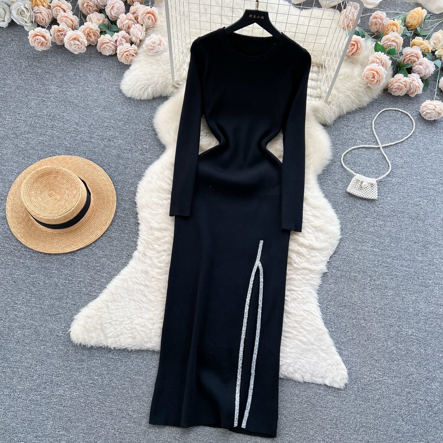 スリット、タイトなラウンドネックデザイン、ニッチスタイルのセレブロングスカートを備えた軽くて豪華なヨーロッパとアメリカスタイルのハイエンドニットドレスの女性 Oネック ヨーロピアン lyxaj26209780240