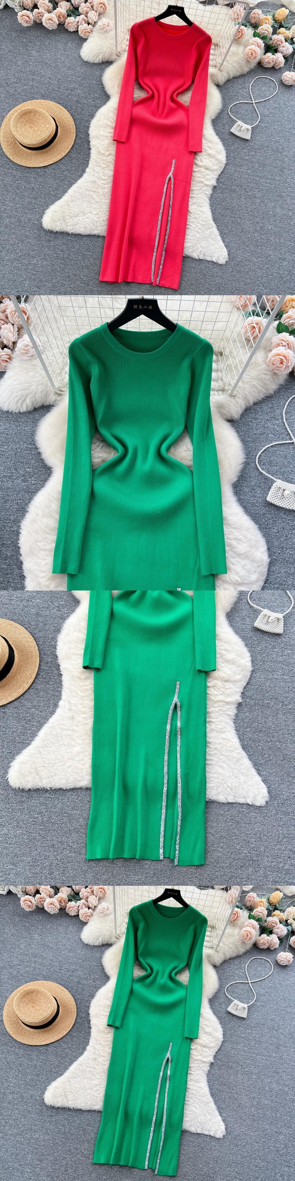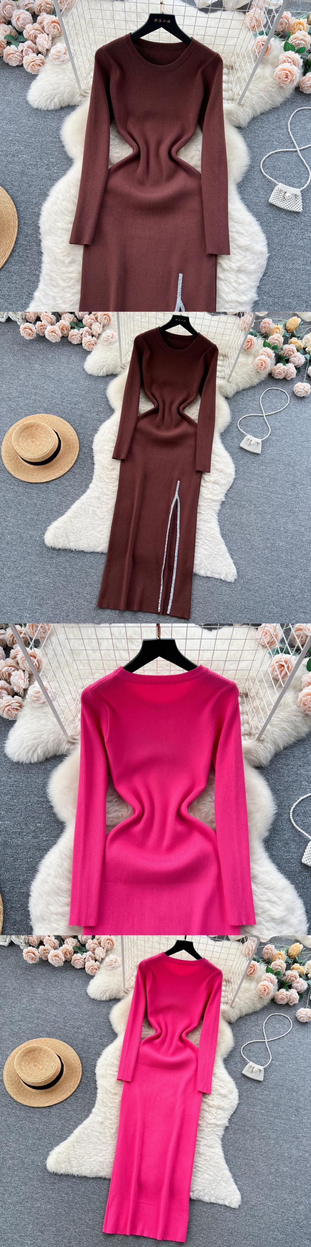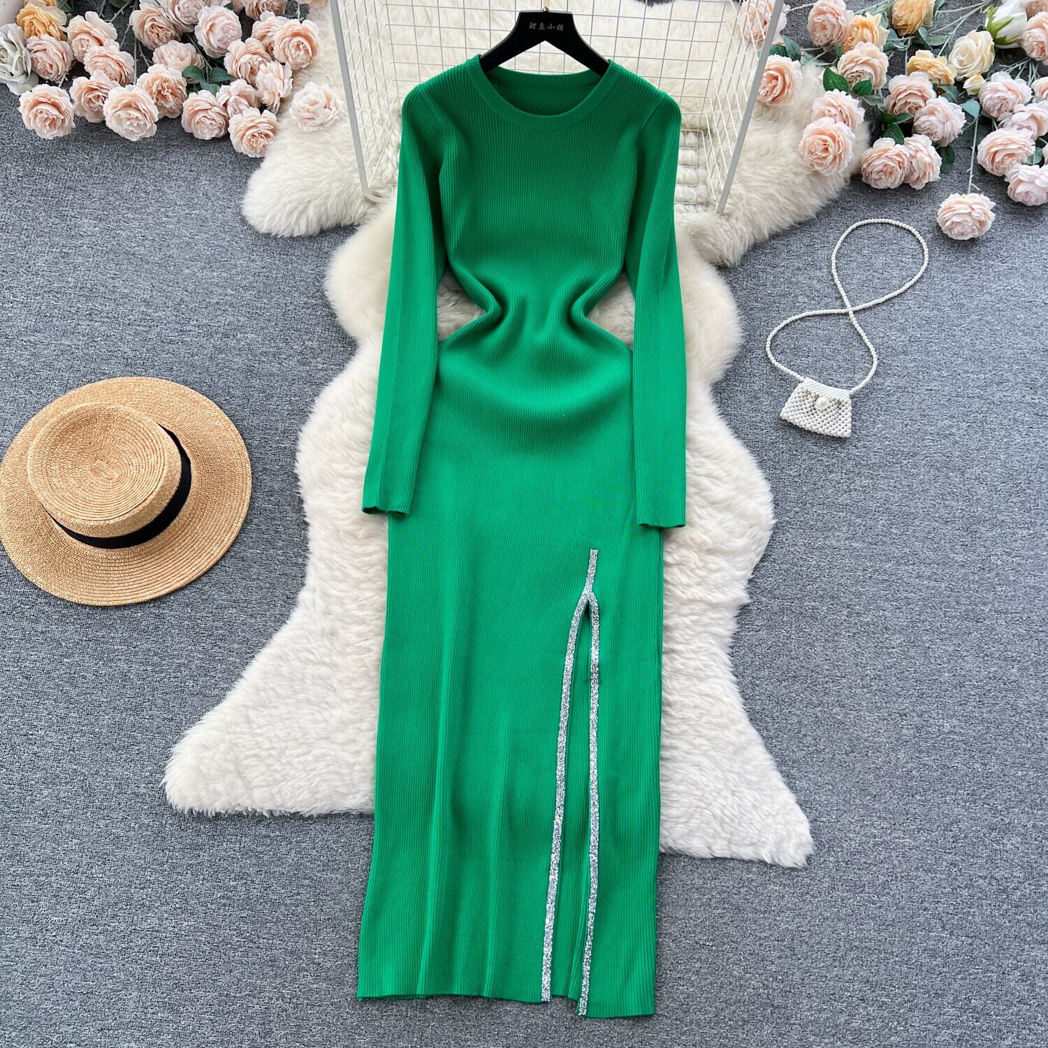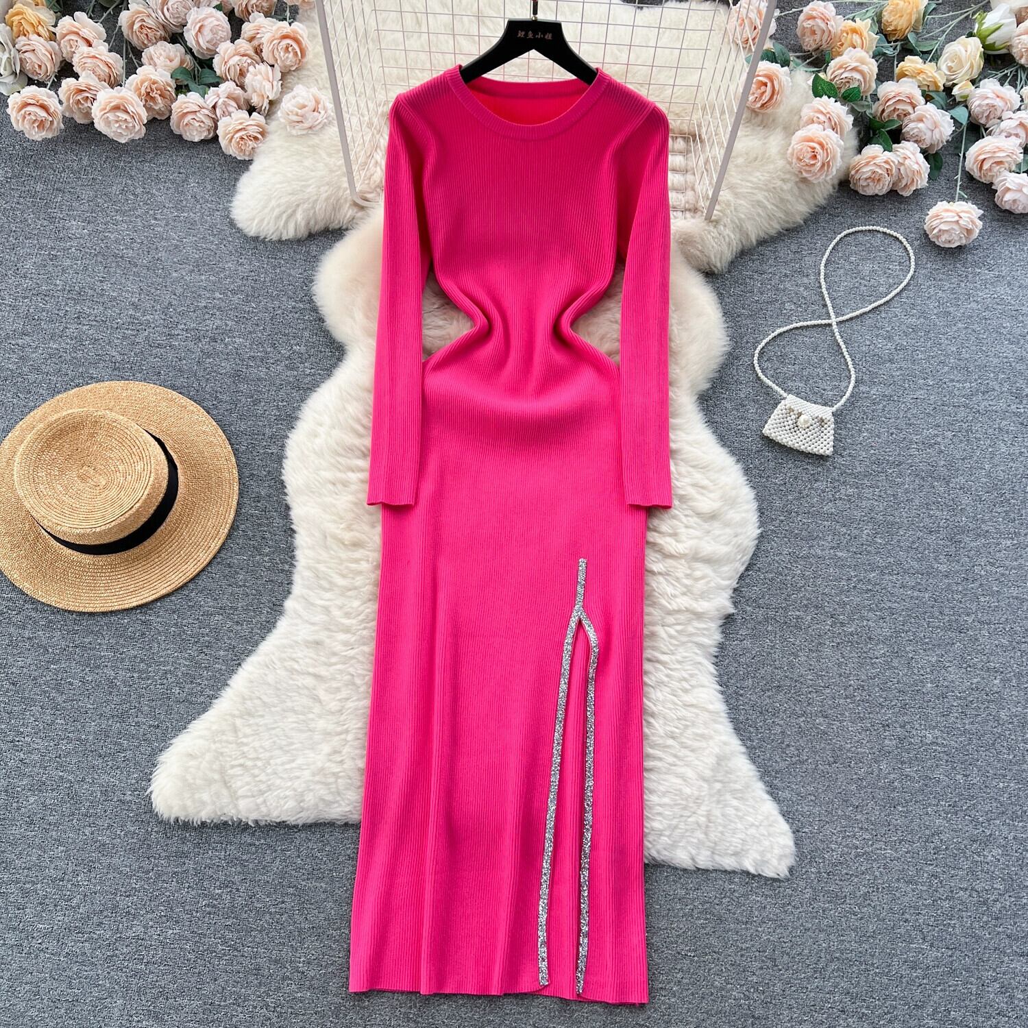 スリット、タイトなラウンドネックデザイン、ニッチスタイルのセレブロングスカートを備えた軽くて豪華なヨーロッパとアメリカスタイルのハイエンドニットドレスの女性 Oネック ヨーロピアン lyxaj26209780240