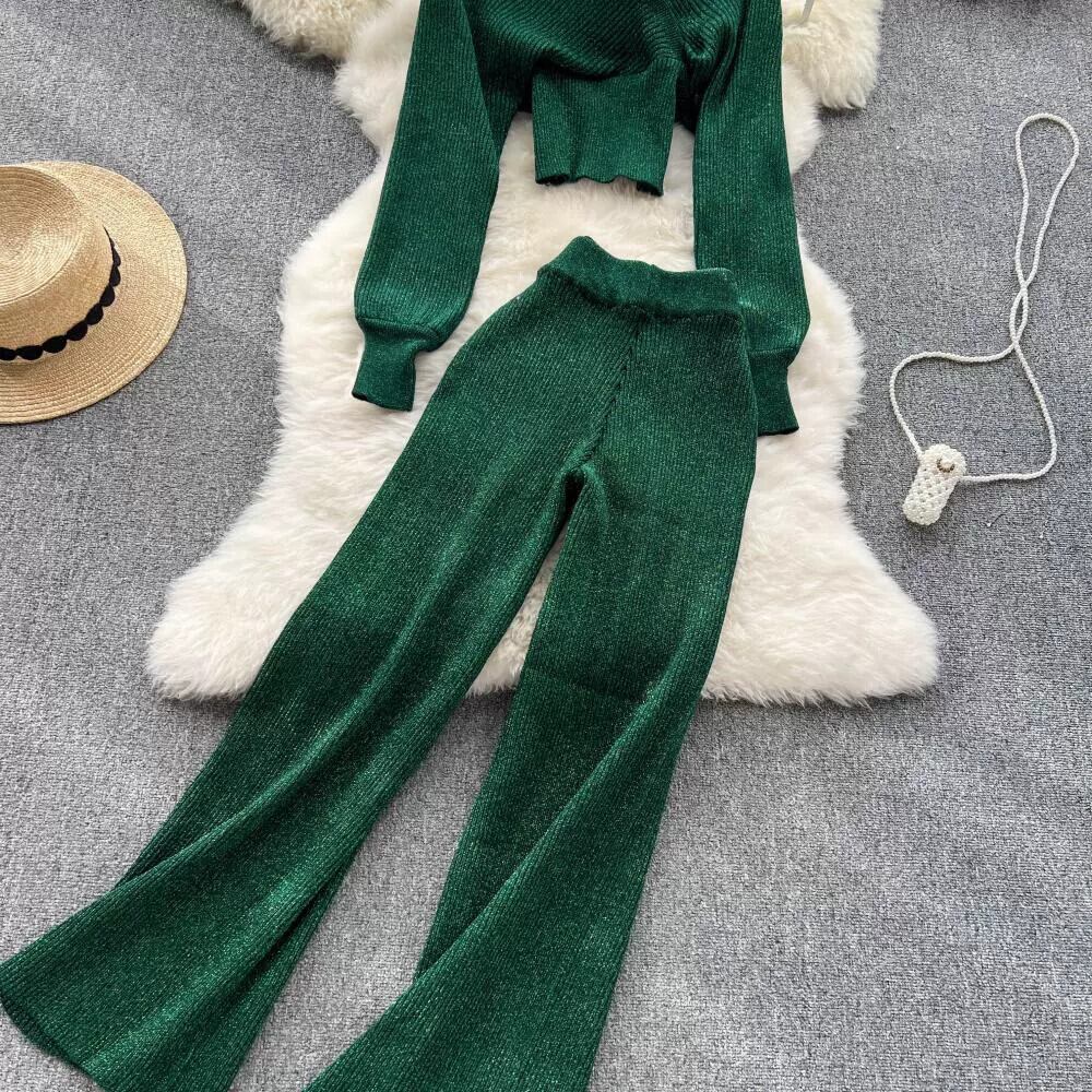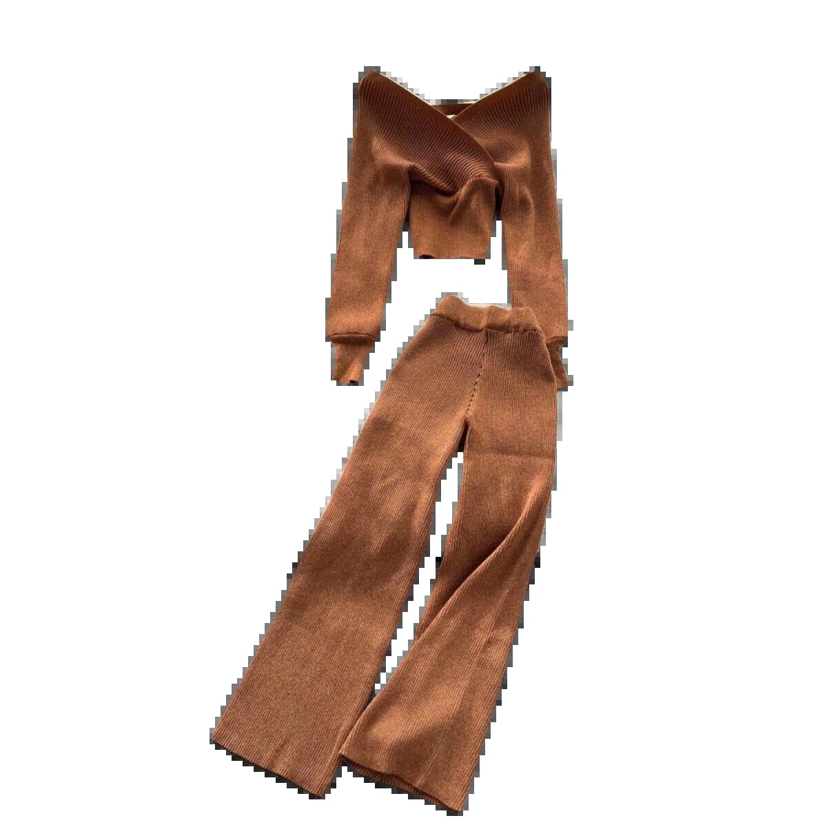 ニットファッションスーツレディース V ネックセクシーなショートニットセーター + 伸縮性ウエストドレープワイドレッグカジュアルパンツ 2 点セット エラスティック Vネック lyxaj11622598689