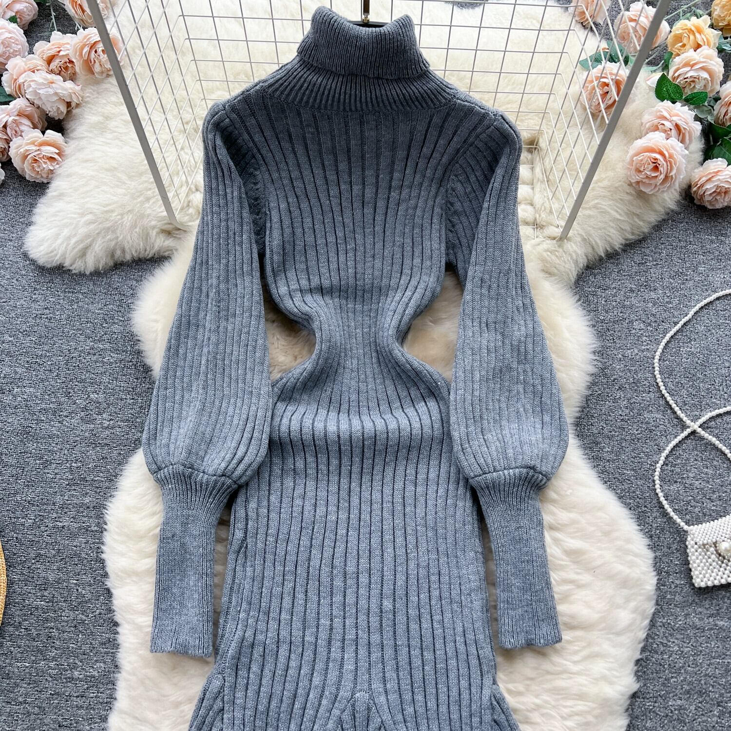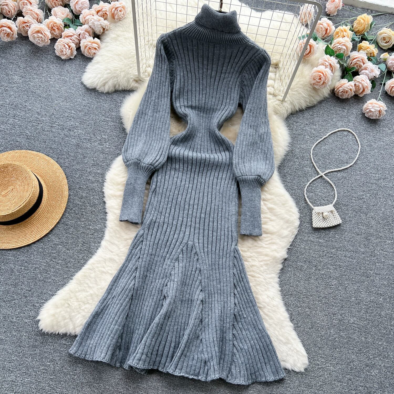 秋と冬のシックなレトロスリムフィットミッドレングスフィッシュテールロングスカートの襟ニットドレスの女性 オータム 秋物 ウィンター 冬物 lyxaj91377772920