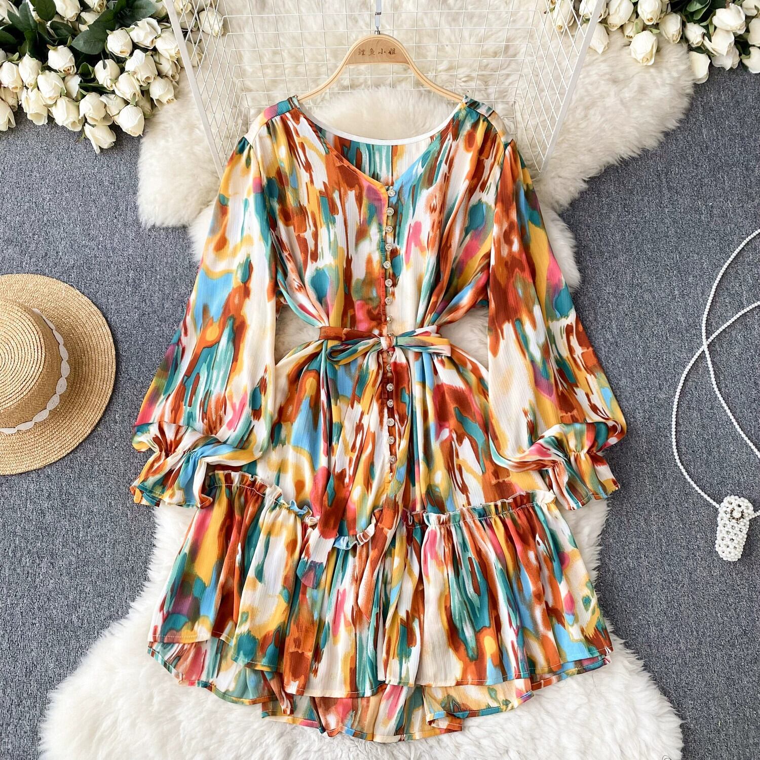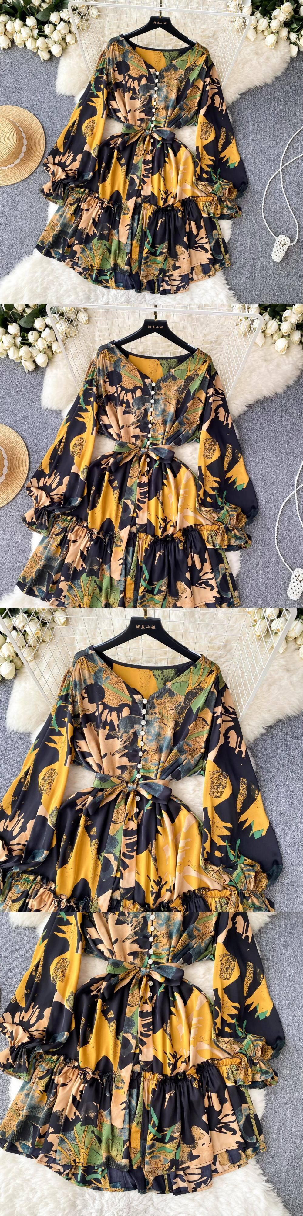 フレンチドレス レディース 秋 ルーズ レイジー 長袖 ウエスト 休暇 ドレープ プリント スカート ロング オータム 秋物 lyxaj10205513397