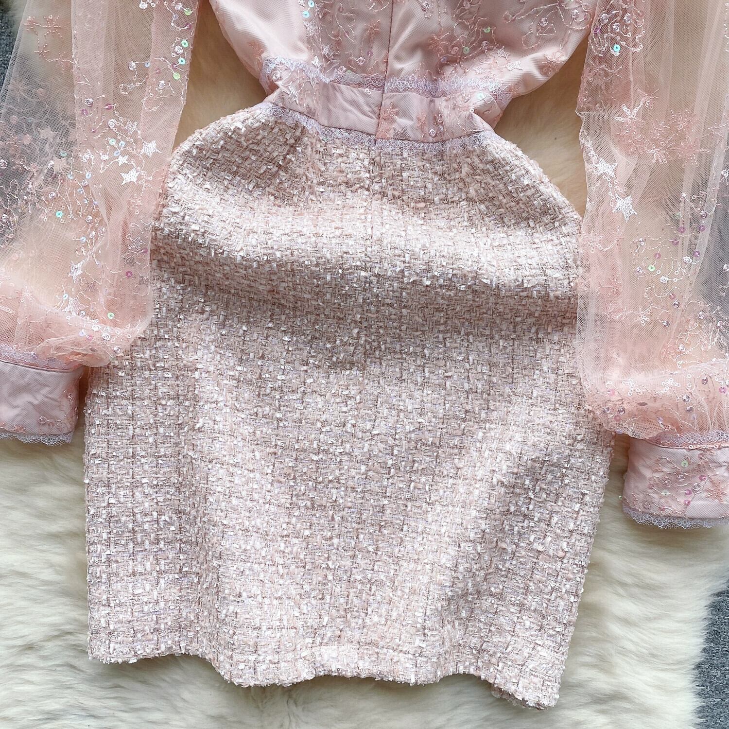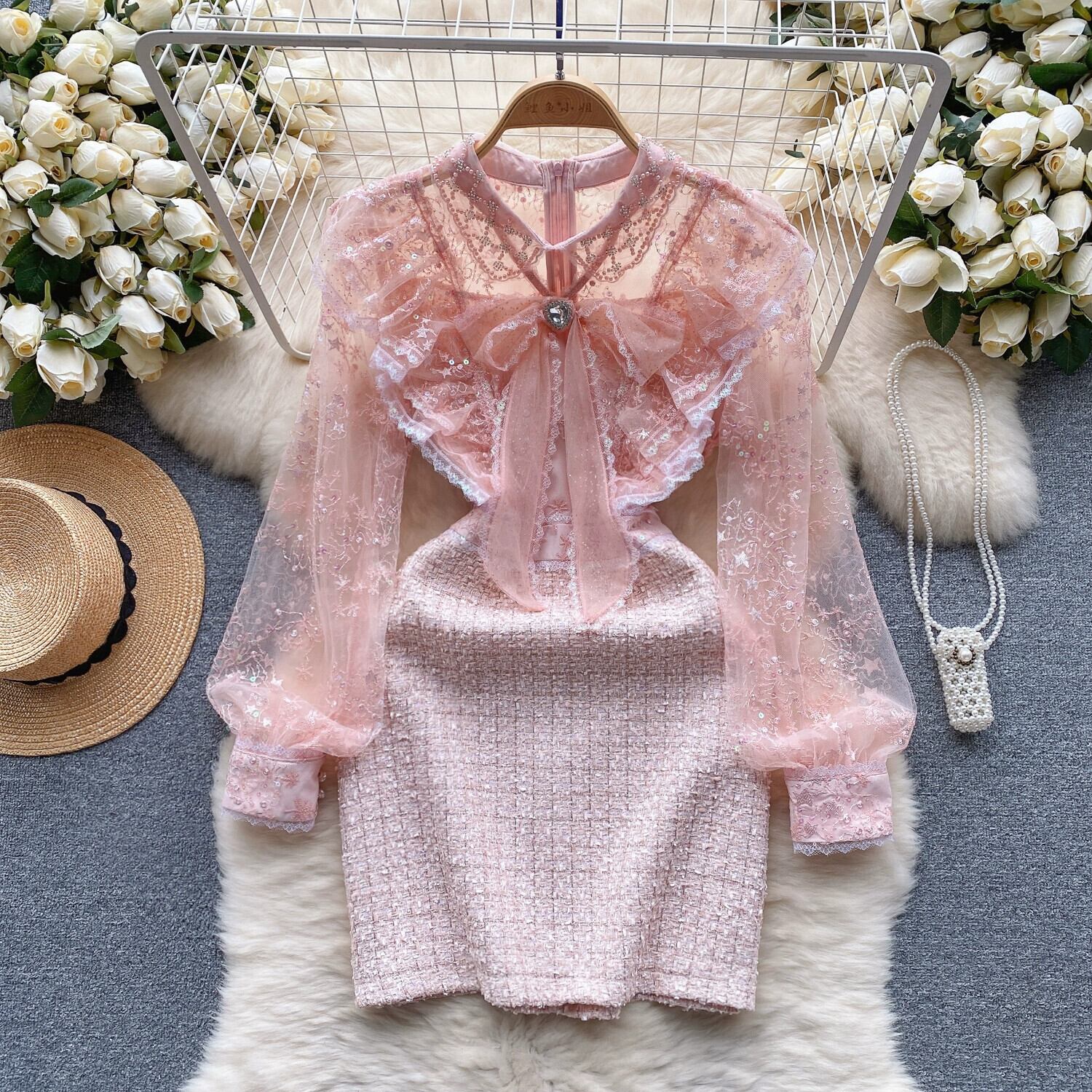 裕福な家族の娘スーツスカートデザイン偽ツーピースドレス女性甘いメッシュパフスリーブスプライシングウールスカート 大人ガーリー スウィート キュート カジュアル lyxaj40993773661