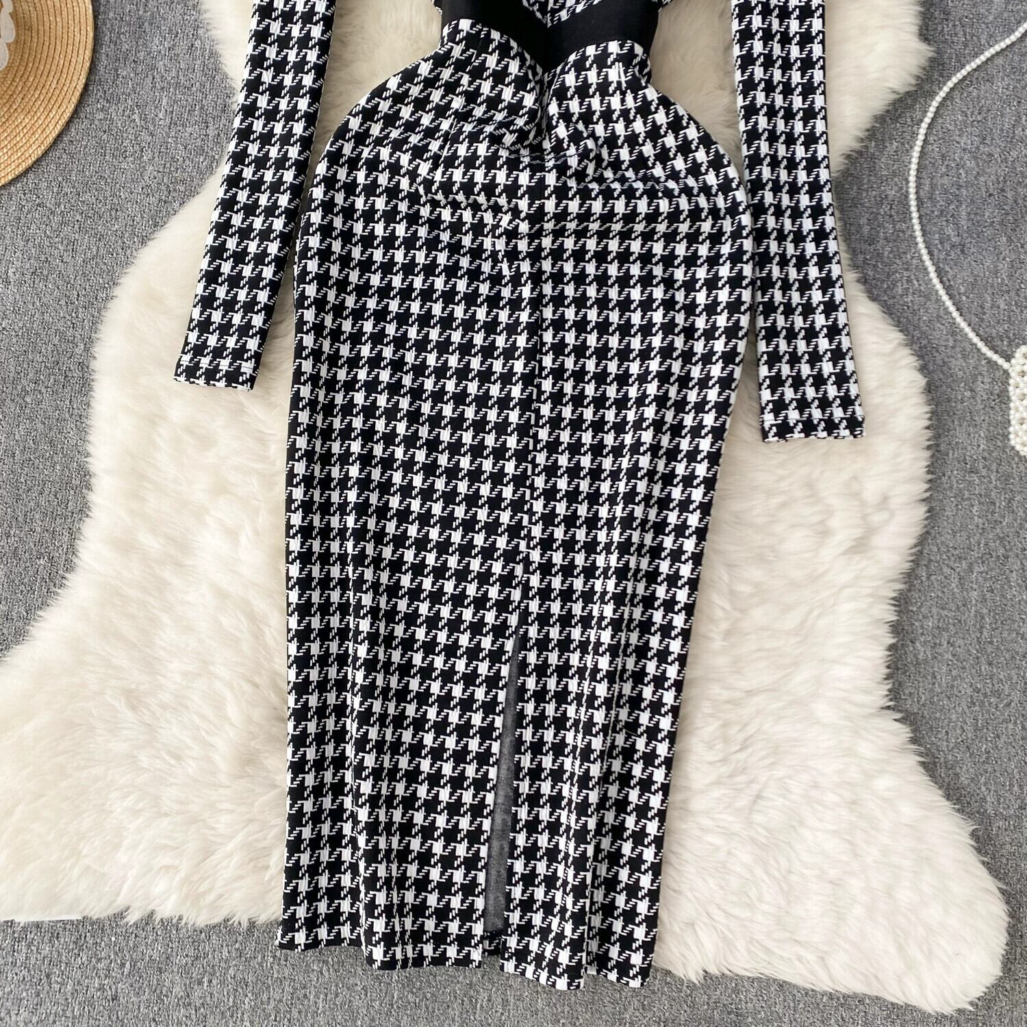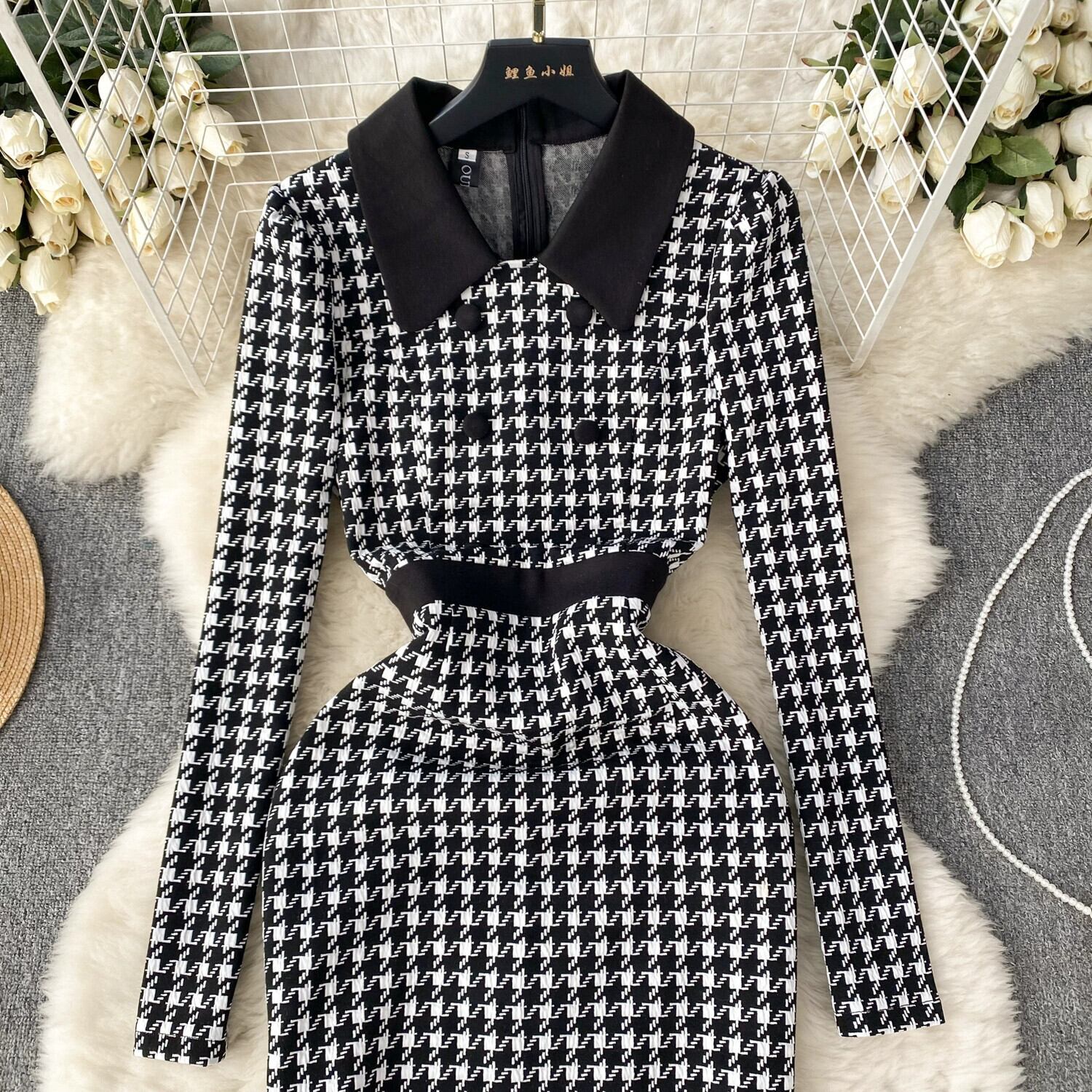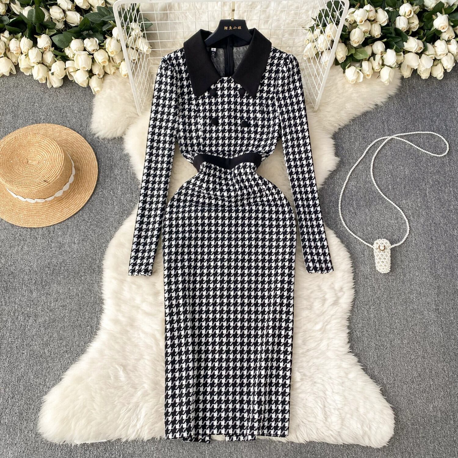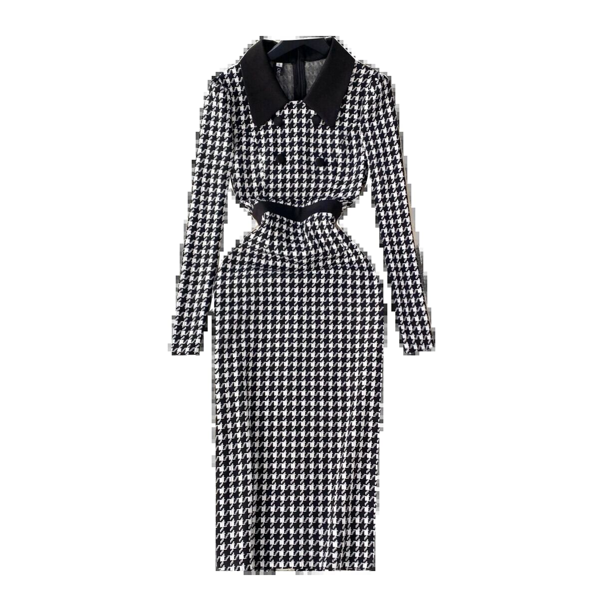 反逆的なゴールドスタイルのハイエンド千鳥格子ドレス女性ウエストポロ襟デザインニッチライト高級ロングスカート lyxaj98159679378
