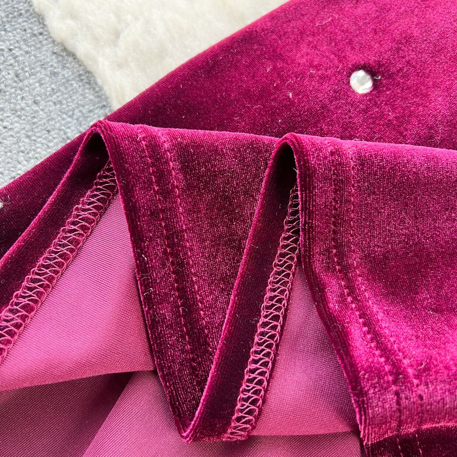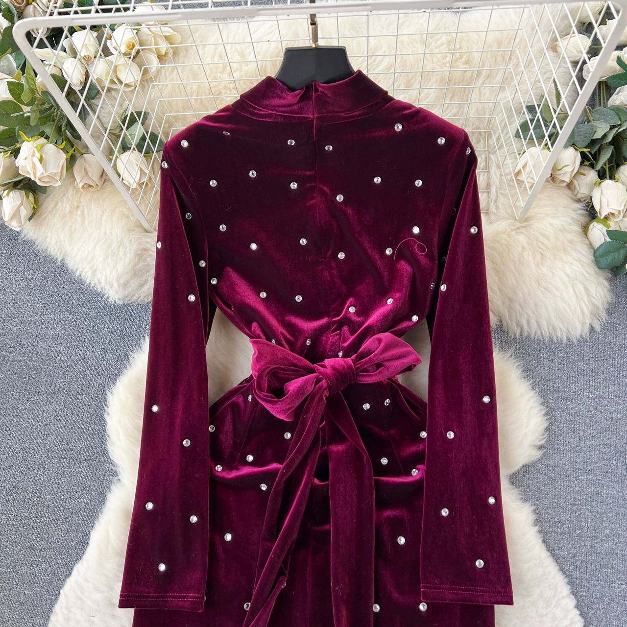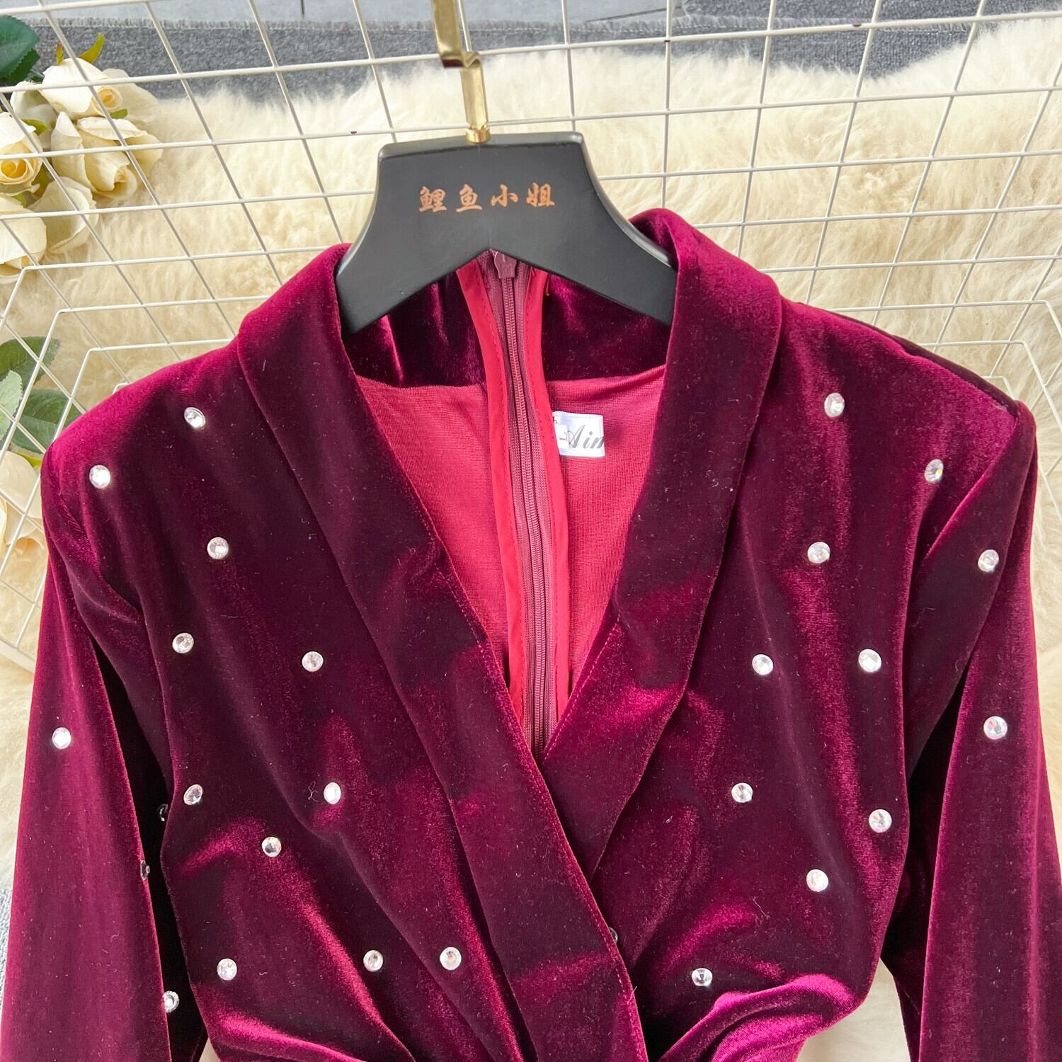 ゴールドベルベットダイヤモンドがちりばめられたドレス女性ロイヤルレディース、ハイエンドレトロVネックウエスト痩身フレンチドレスロングスカート lyxaj15395957758