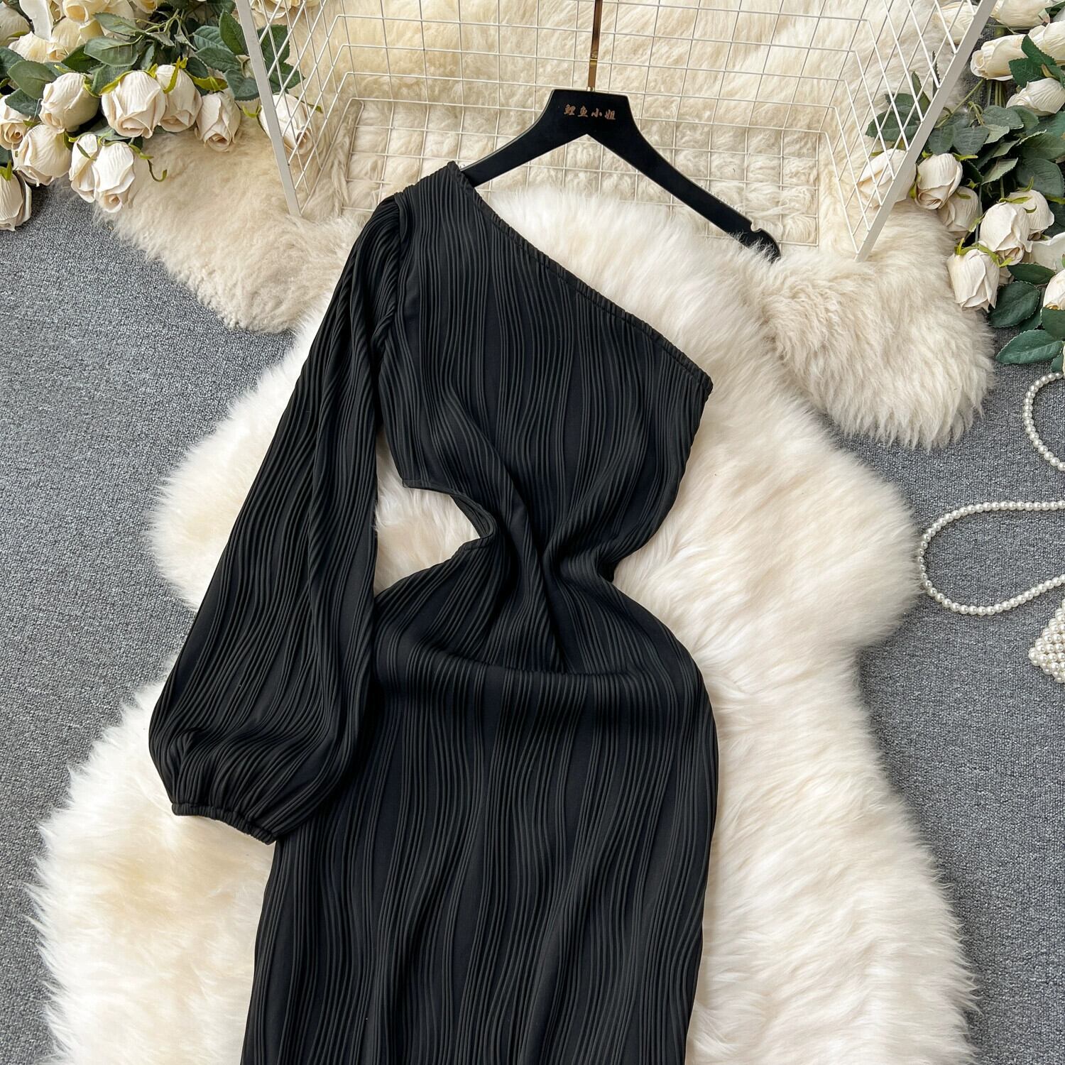 -端の絶妙なドレスの女性、軽くて豪華な気質、斜めのネック、オフショルダー、ウエストバッグとヒップスカート、ニッチな腰を露出した宴会ドレス lyxaj44708908089