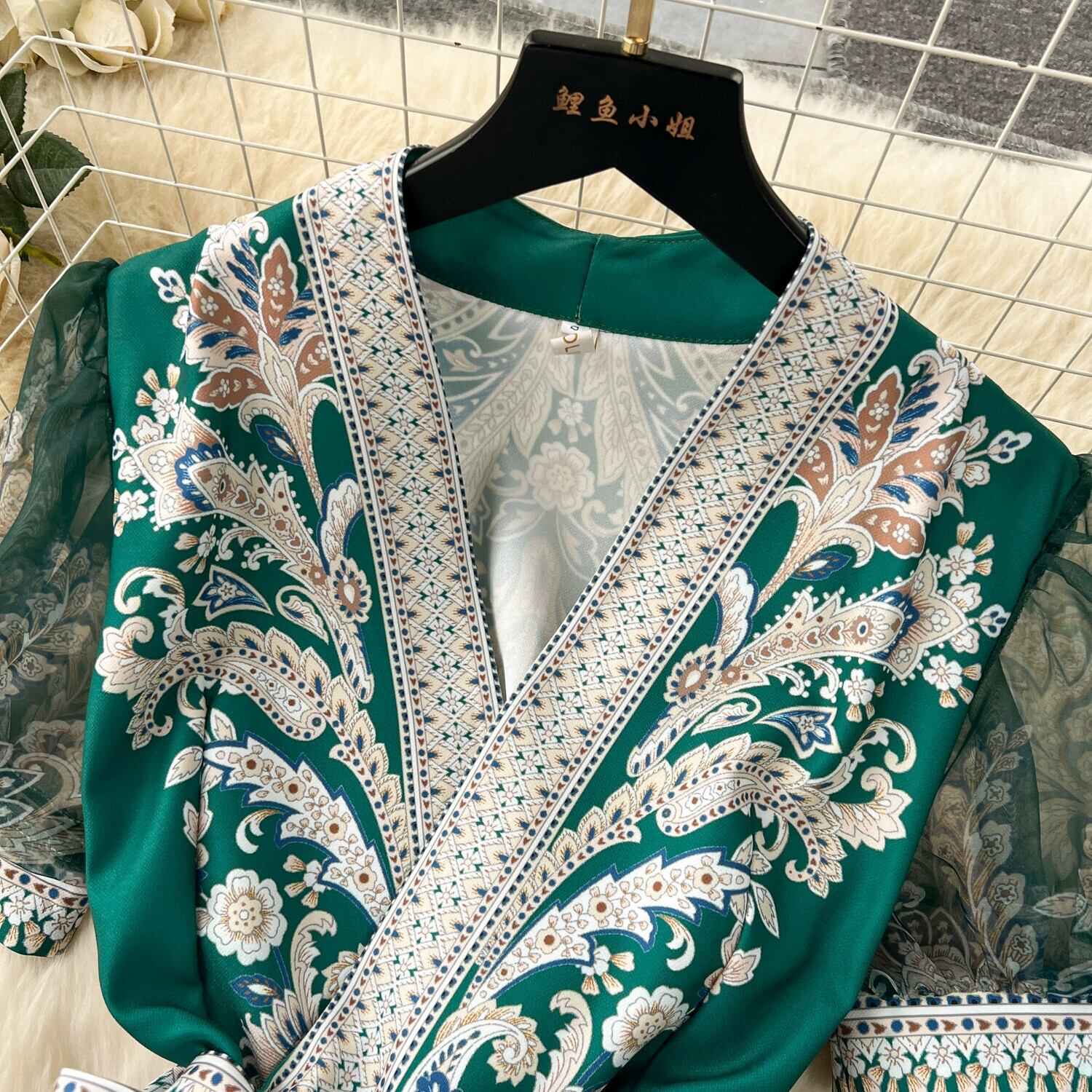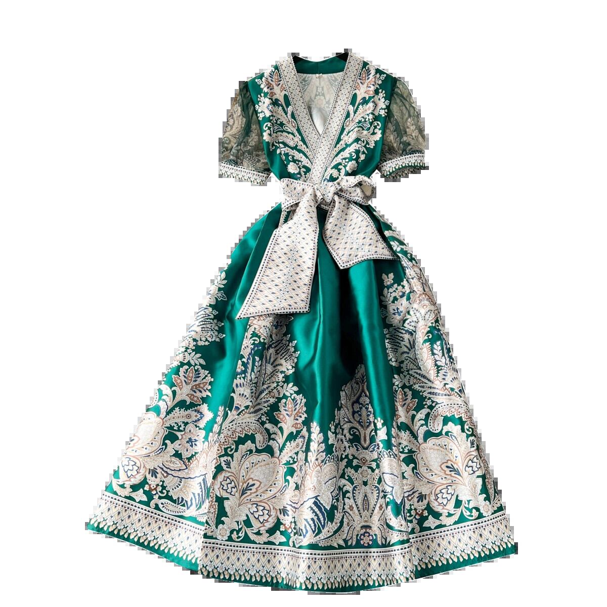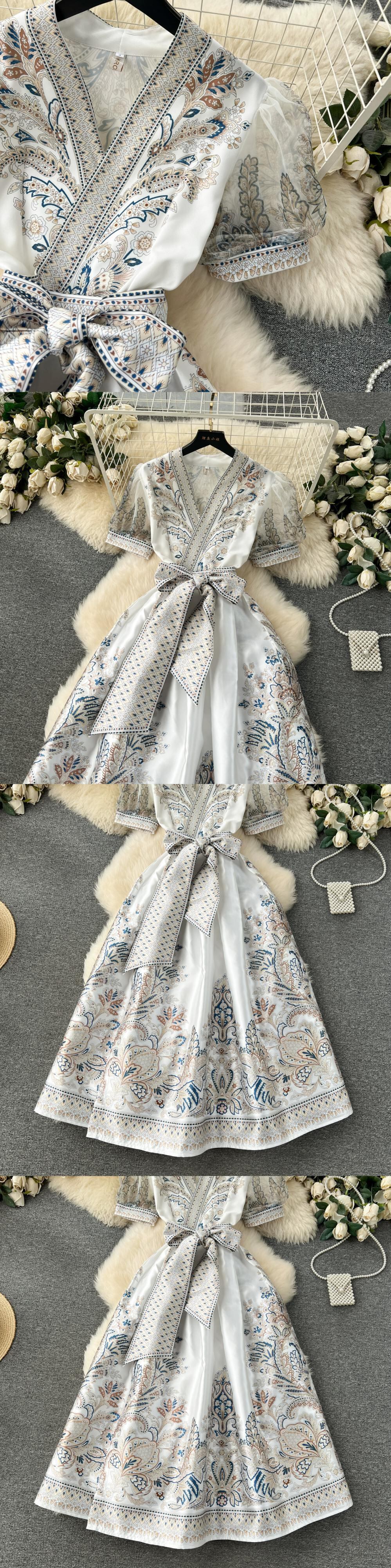 レトロな宮殿スタイルのドレスの女性デザインセンスプリントストラップウエストロングフレンチパフスリーブ気質ドレス女性 レース lyxaj46259509784