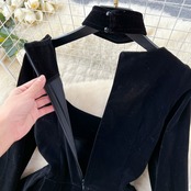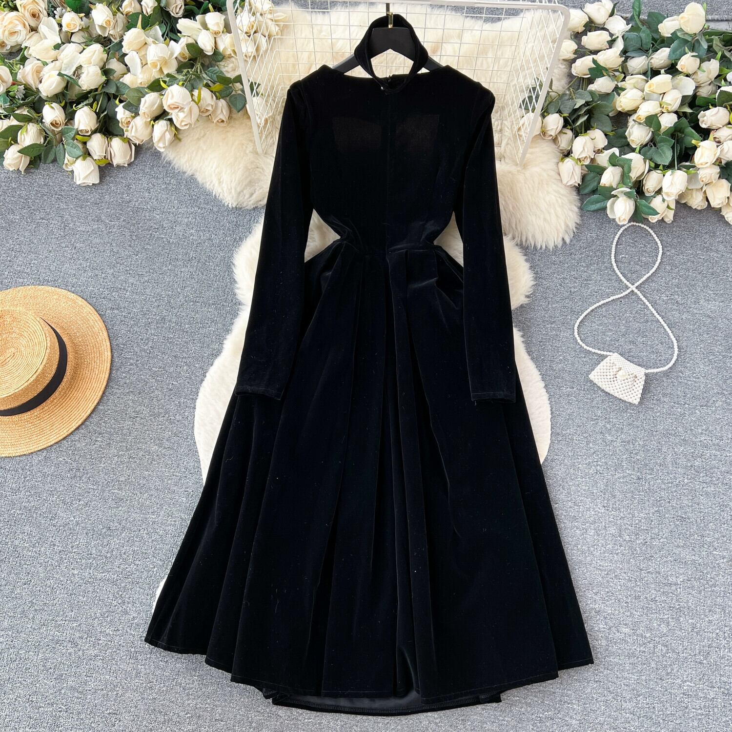 ヘップバーンスタイルのハイエンドドレス女性ロイヤルウィンタードレスフレンチレトロスクエアネック長袖ゴールドベルベットリトルブラックドレス ロング 冬物 スクウェア lyxaj51036610954