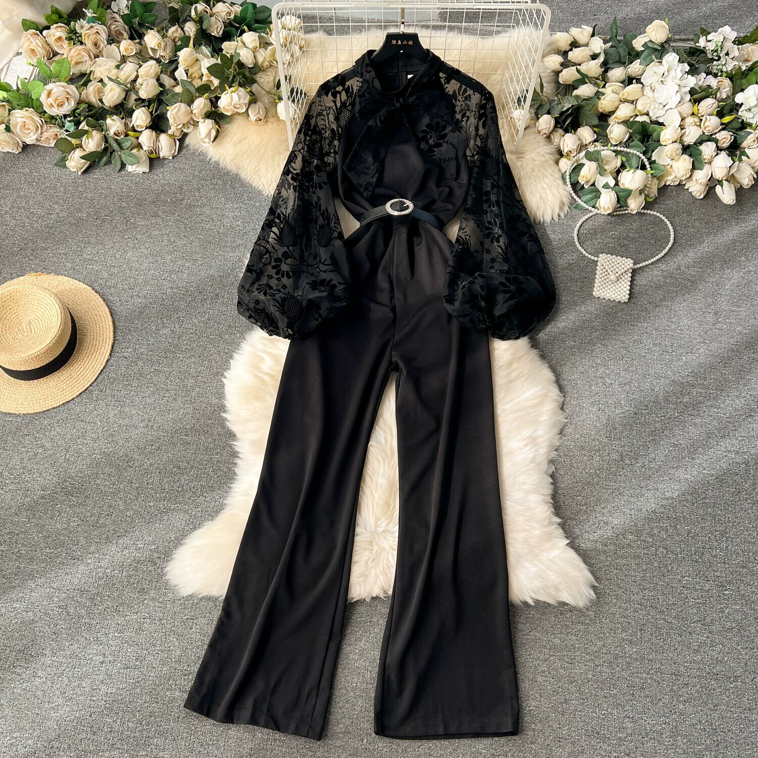 軽くて豪華なパレススタイルのパフスリーブ、重厚な刺繍、リボンカラー、スリムなロングジャンプスーツ、女性用の高級ワイドレッグパンツ レース lyxaj960152591