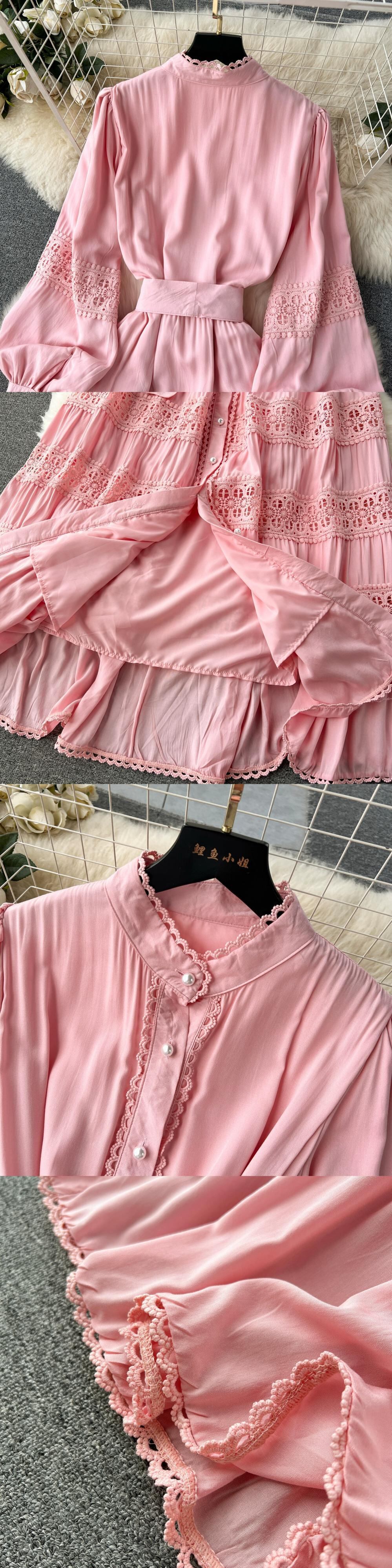 フレンチジェントルスタイルドレス、春ドレス、レディースデザイン、中空レース継ぎ、パフスリーブロングドレス、ホリデードレス スプリング 春物 lyxaj63409654825