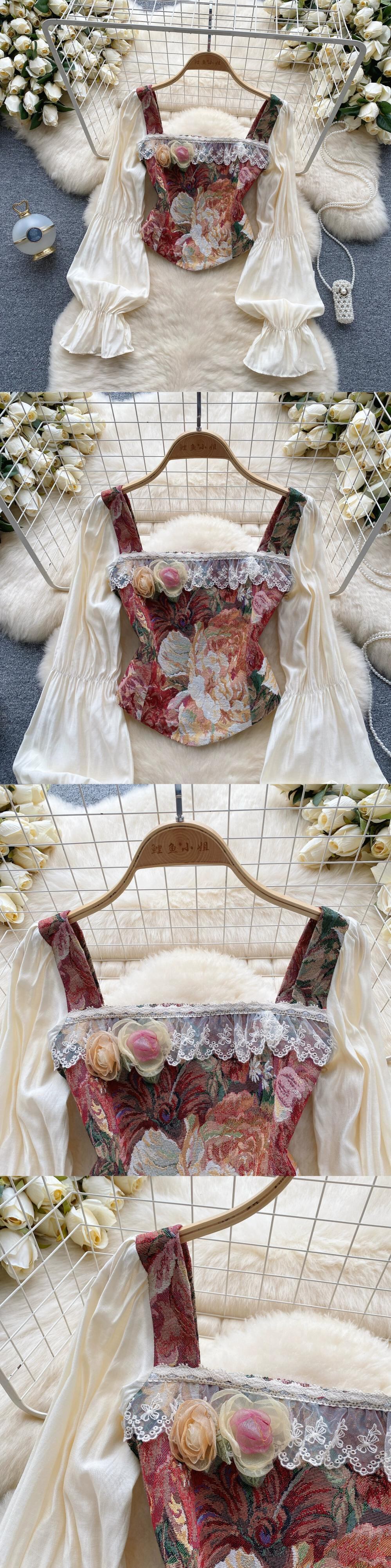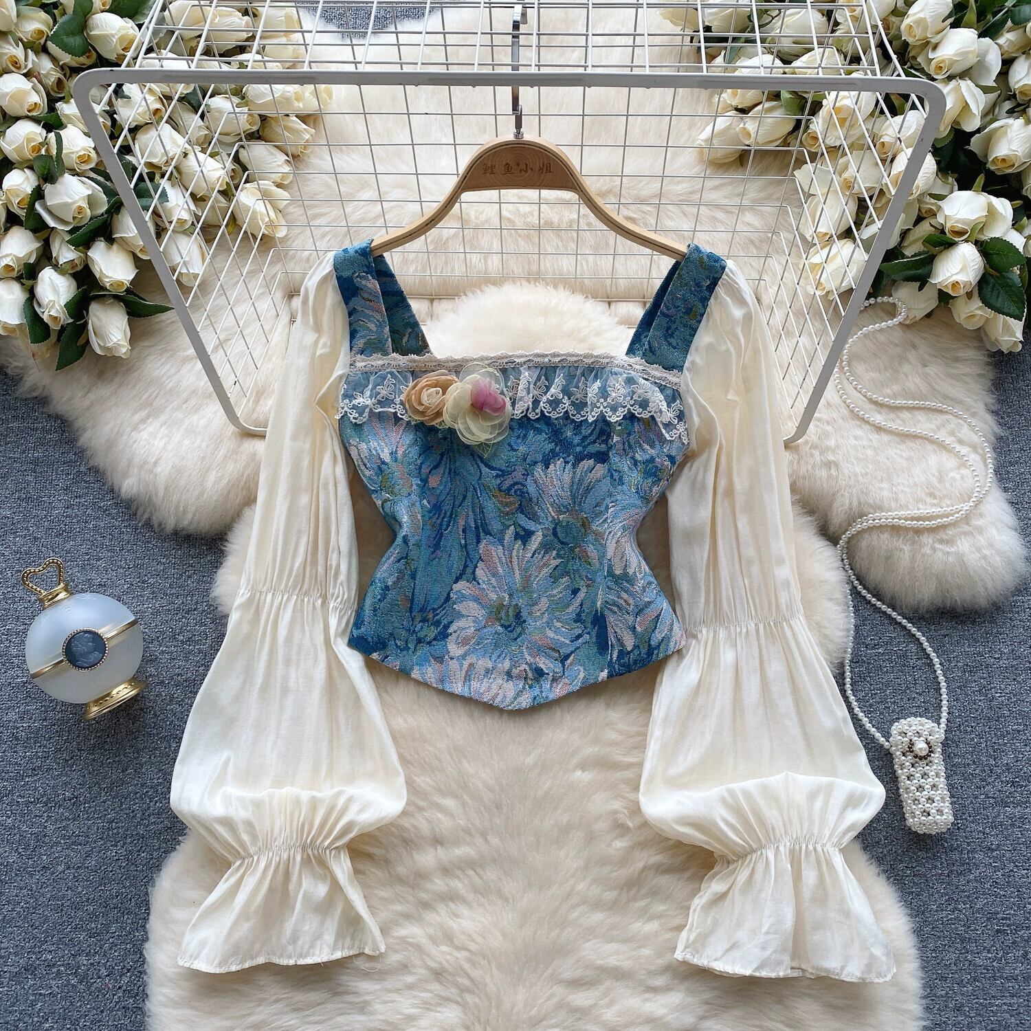 フランス宮殿スタイルのハイエンド花柄スクエアカラーシャツ女性秋レーススプライシングデザイン気質トップ オータム 秋物 スクウェア lyxaj19243275014