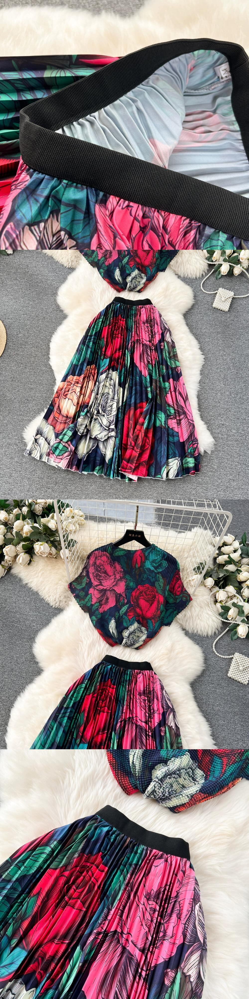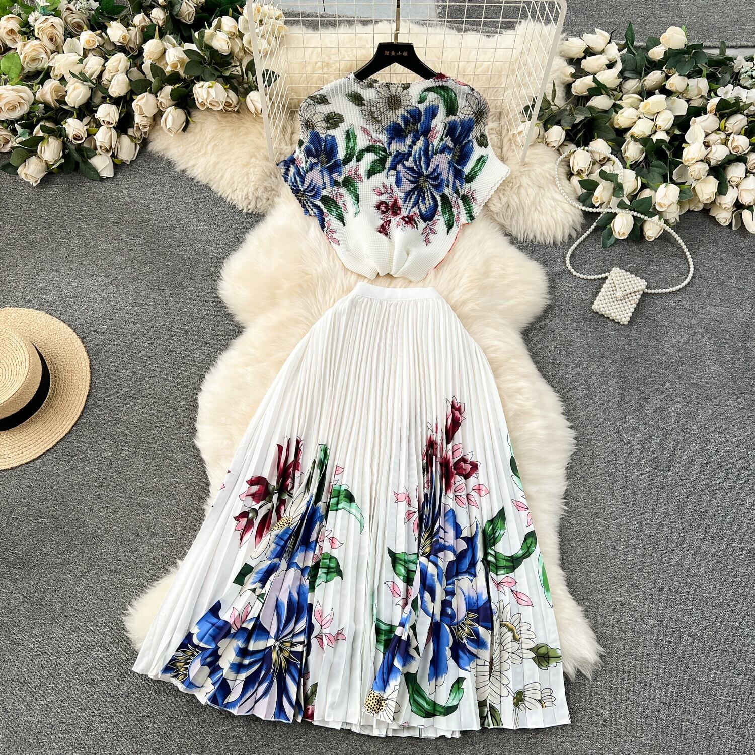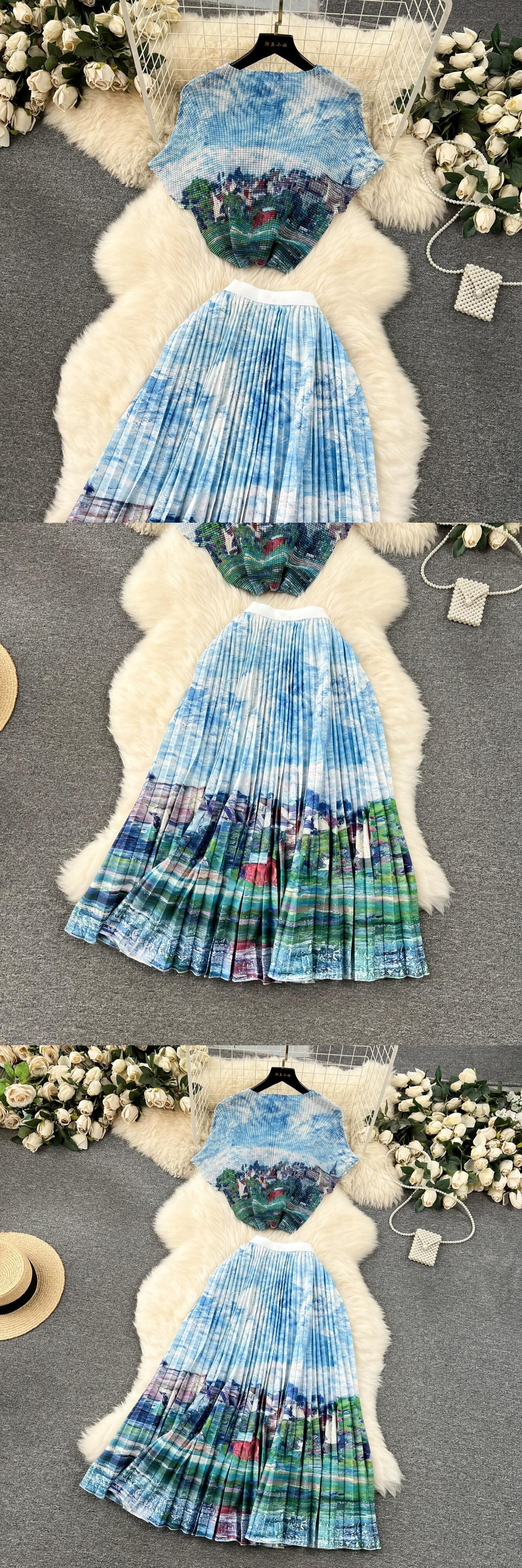 - 三宅プリーツプリント半袖Tシャツ、ファッショナブルで万能なロングプリーツスカート、社交界のツーピーススーツ lyxaj40318898423