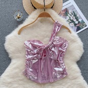 2023 レトロセクシーなホットガールワンショルダーストラップチューブトップ女性のサテン PU レザーチェストラップトップ lyxaj74831570852