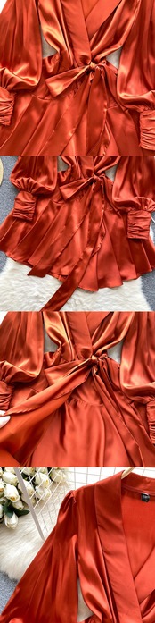 Yujie は高級サテンドレスの女性 2024 新作春フレンチパフスリーブワンピースラップドレスを着ています スプリング 春物 lyxaj86243915755