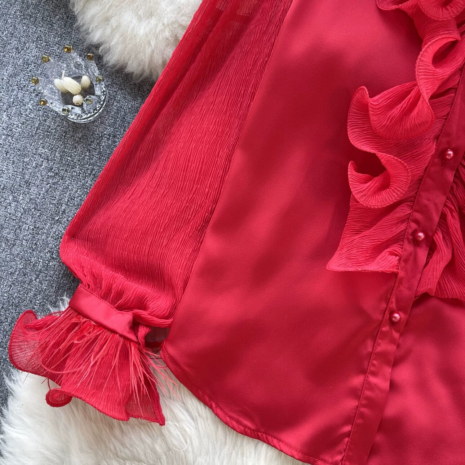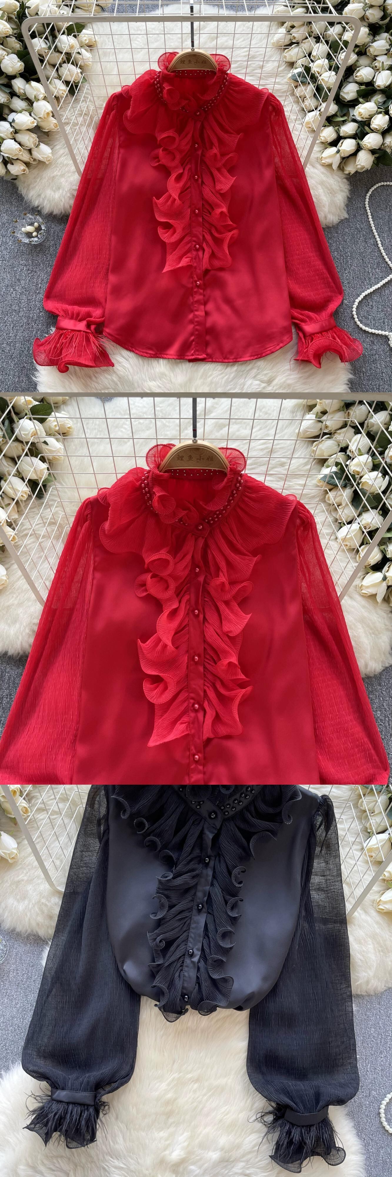 2024 早春シフォン シャツ レディース プリーツ フリル スリム フィット 多用途 フレンチ パフ スリーブ トップ スプリング 春物 lyxaj14582135934