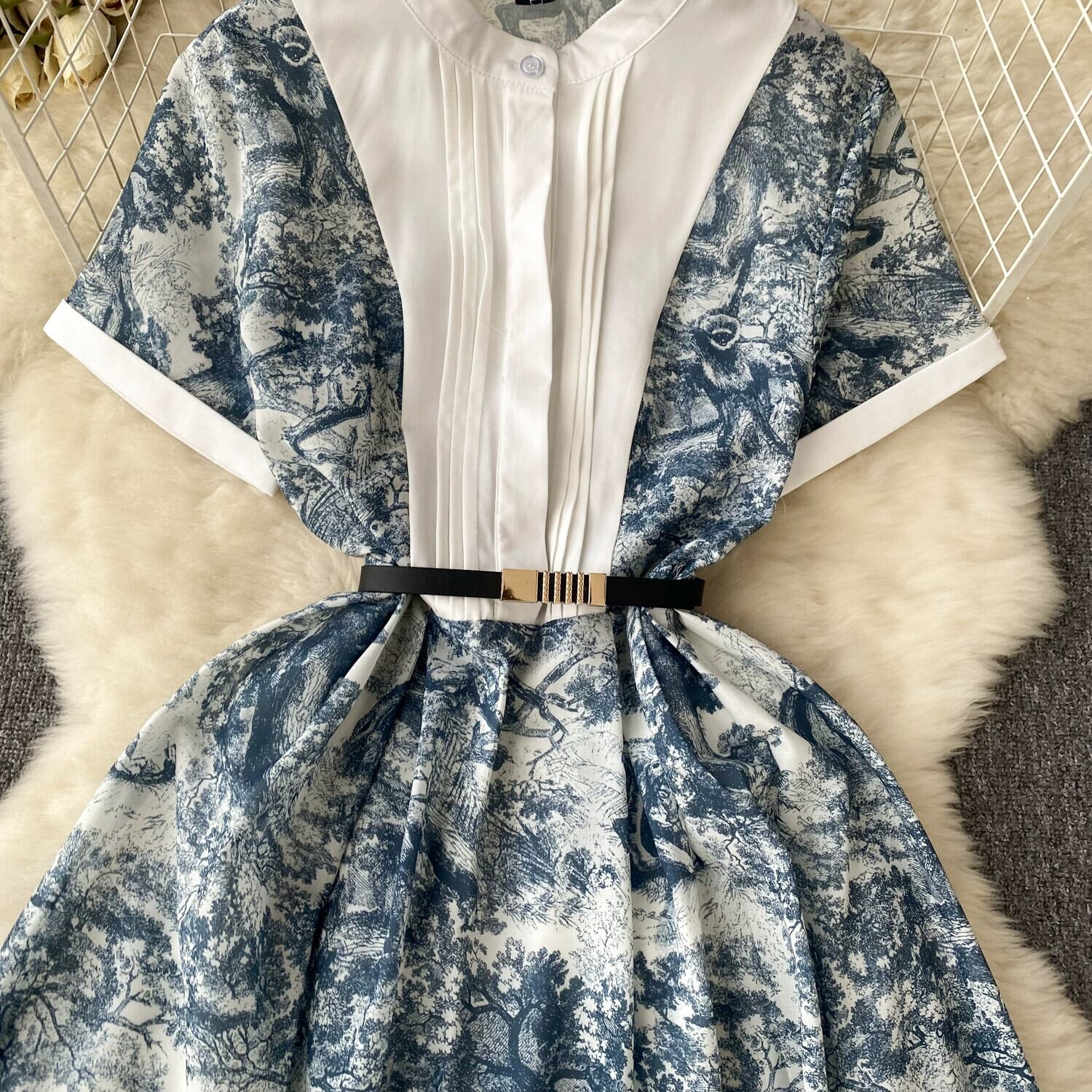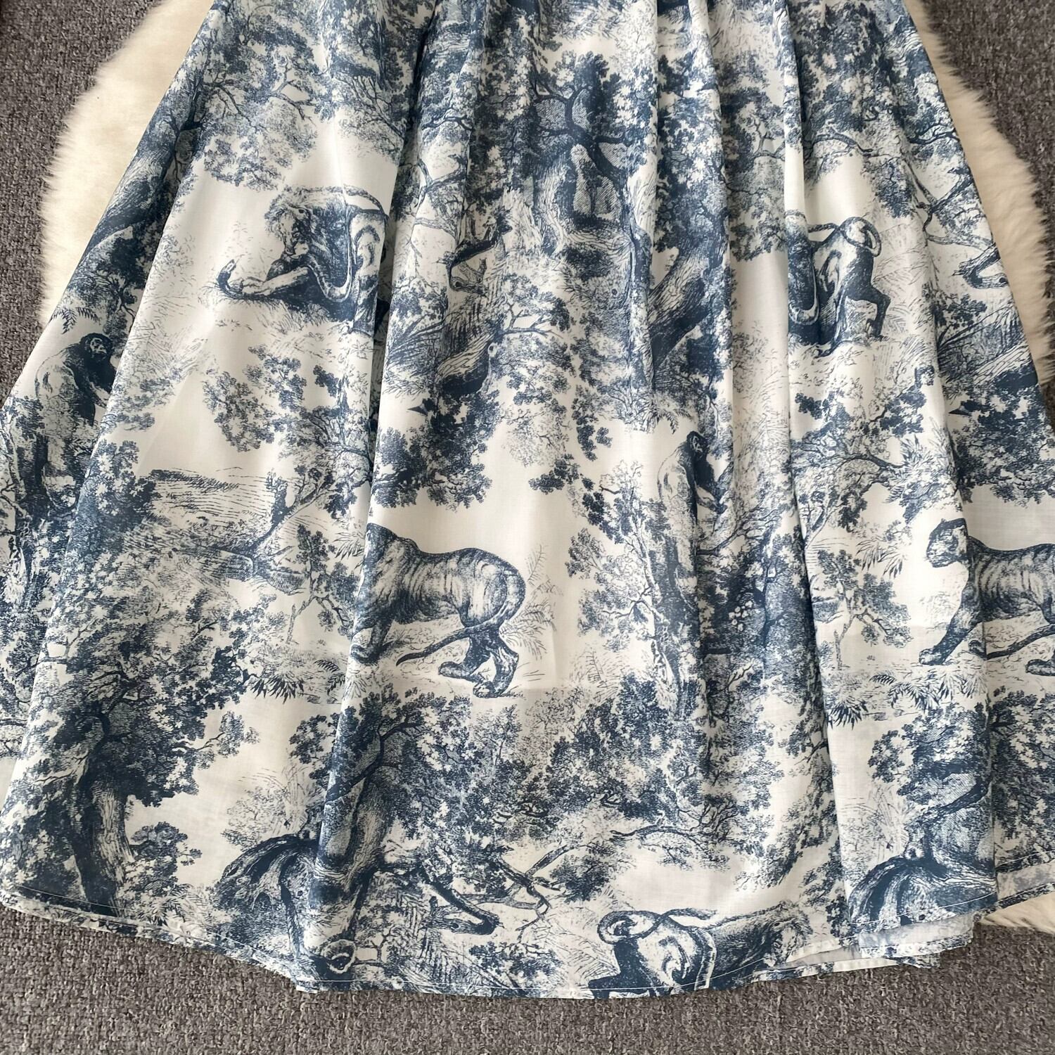 フランス宮殿スタイルのハイエンド半袖プリントドレス女性ウエストデザインニッチシックなスーパー妖精気質ロングスカート レース lyxaj18079402158