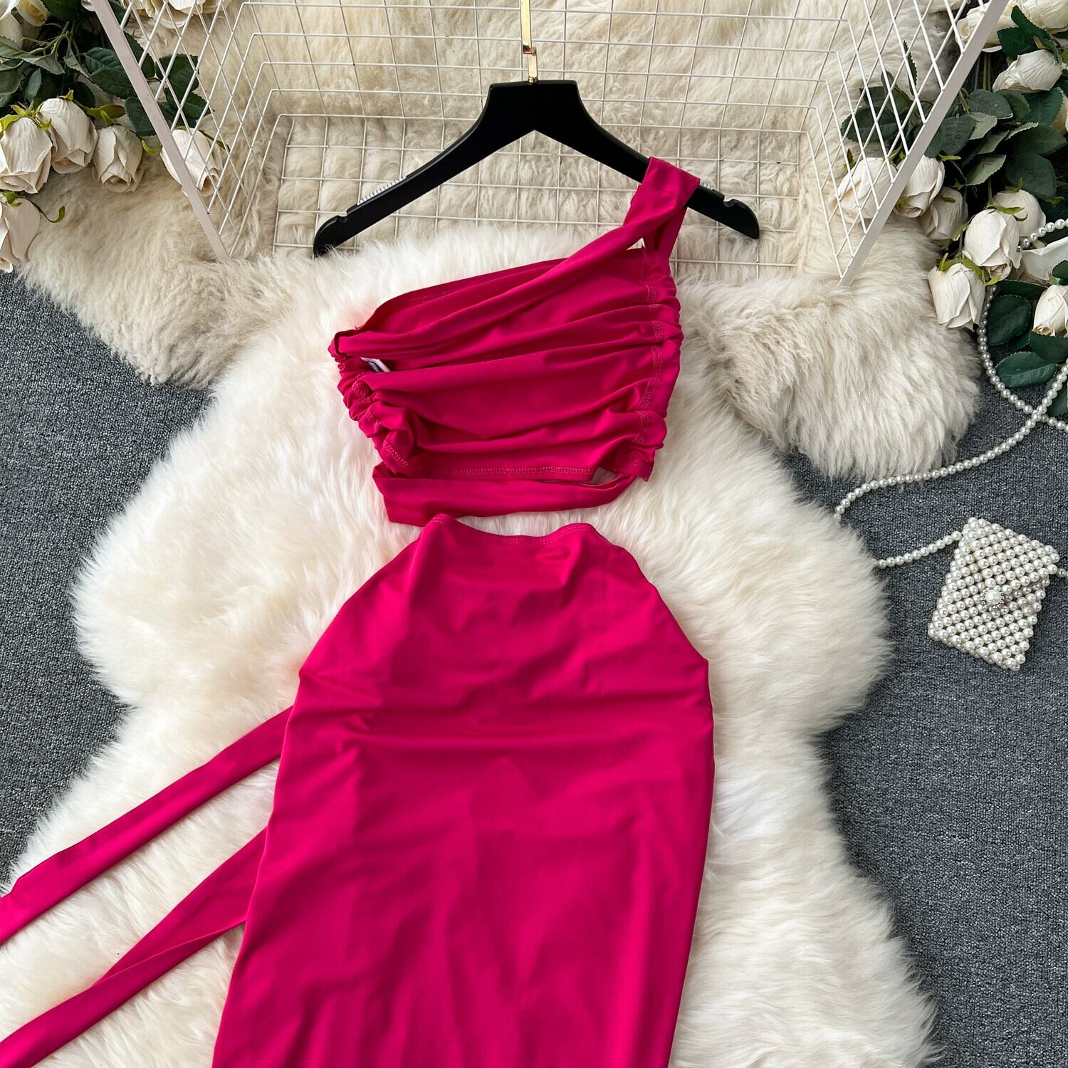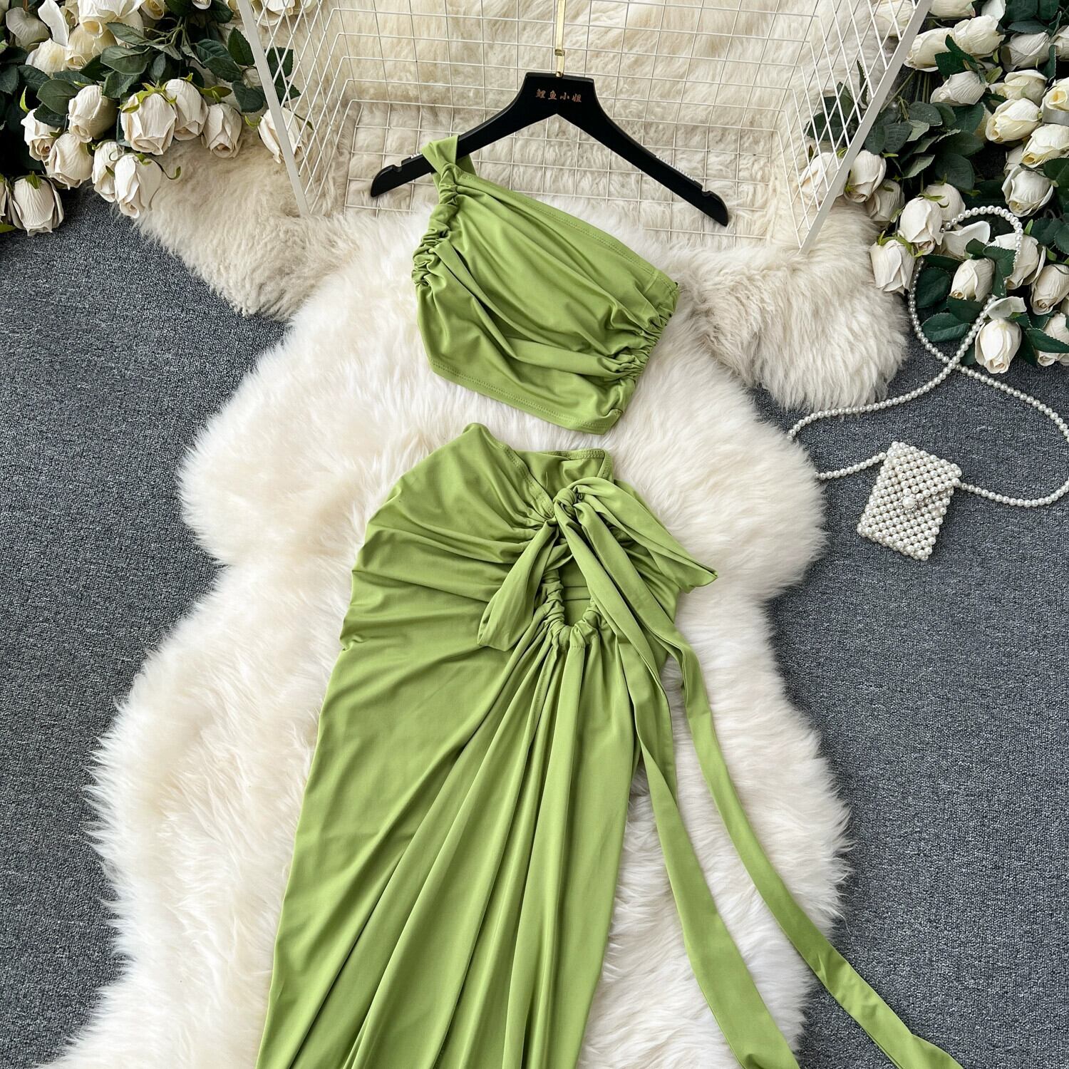 ヨーロッパとアメリカのイン衣装の女性インターネットセレブ、ファッショナブルでシックな斜めショルダーベスト、スリット入りのハイウエストストラップロングスカート、休暇 ハイウェスト ヨーロピアン lyxaj66187409354