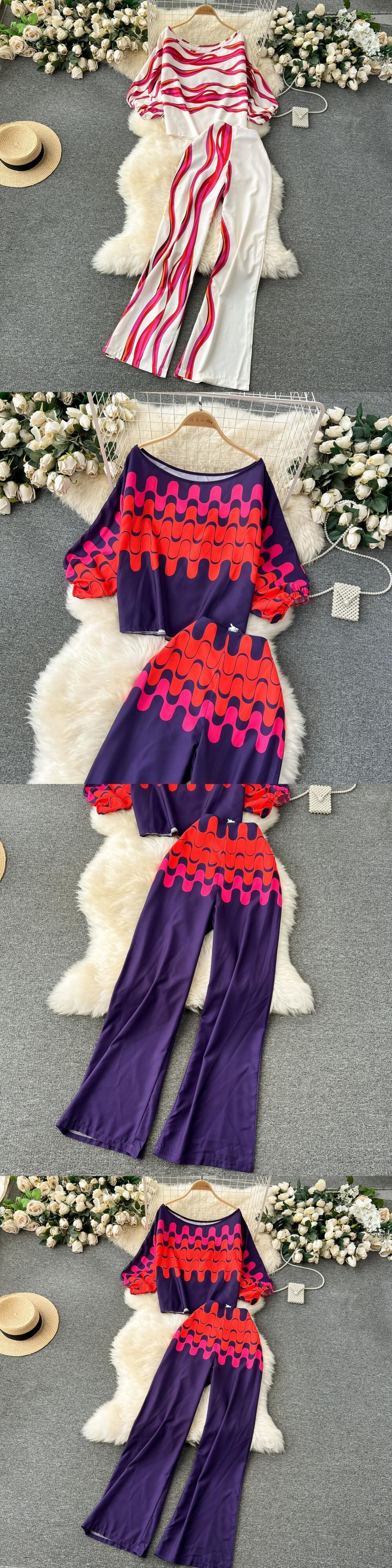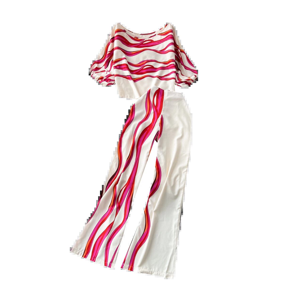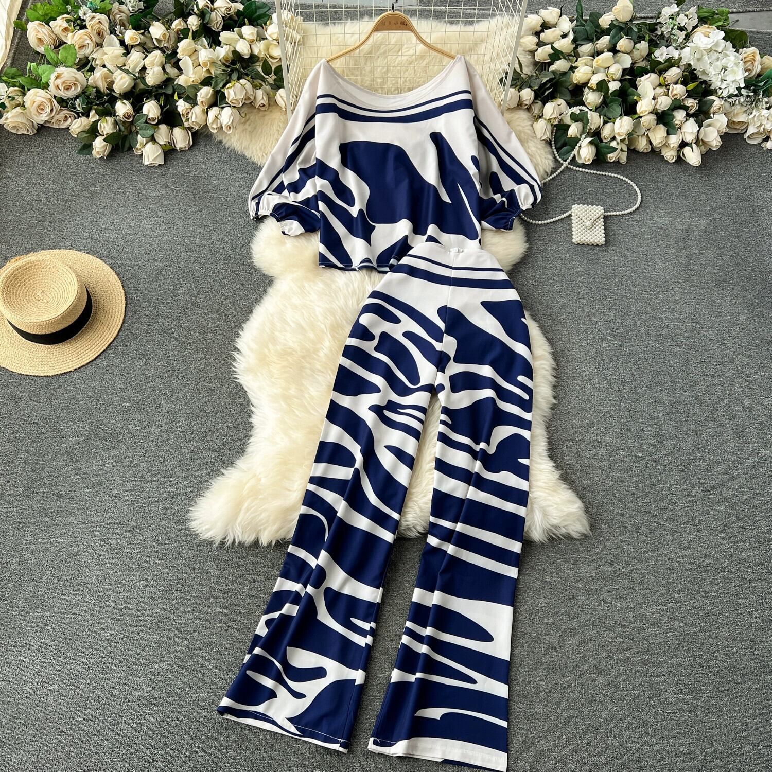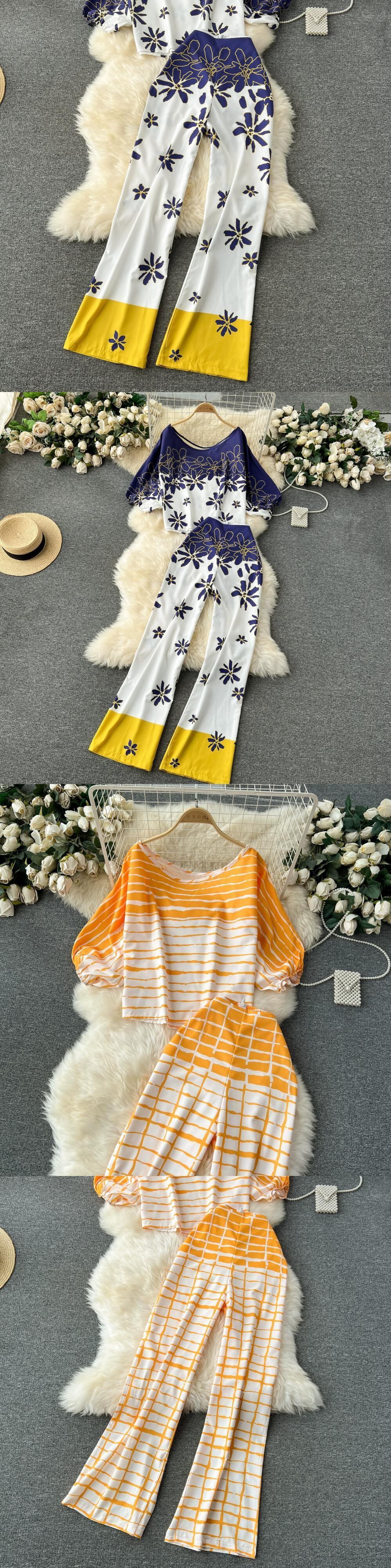 塩系コーデ 軽やかで大人っぽい 2点セット レディース 高級 ゆったり 老け見え プリントトップス ハイウエスト ワイドパンツ lyxaj53411210674